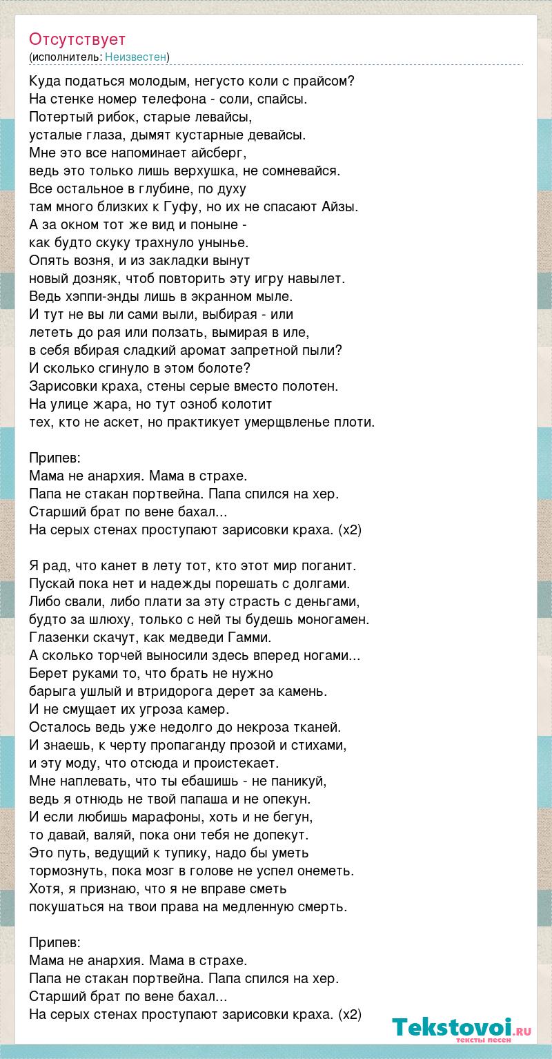 Куда податься молодым, негусто коли с прайсом? На стенке номер телефона - соли, спайсы. Потертый рибок, старые левайсы, усталые глаза, дымят кустарные девайсы. Мне это все напоминает айсберг, ведь это только лишь верхушка, не сомневайся. Все остальное в глубине, по духу там много близких к Гуфу, но их не спасают Айзы. А за окном тот же вид и поныне - как будто скуку трахнуло унынье. Опять возня, и из закладки вынут новый дозняк, чтоб повторить эту игру навылет. Ведь хэппи-энды лишь в экранном мыле. И тут не вы ли сами выли, выбирая - или лететь до рая или ползать, вымирая в иле, в себя вбирая сладкий аромат запретной пыли? И сколько сгинуло в этом болоте? Зарисовки краха, стены серые вместо полотен. На улице жара, но тут озноб колотит тех, кто не аскет, но практикует умерщвленье плоти. Припев: Мама не анархия. Мама в страхе. Папа не стакан портвейна. Папа спился на хер. Старший брат по вене бахал... На серых стенах проступают зарисовки краха. (х2) Я рад, что канет в лету тот, кто этот мир поганит. Пускай пока нет и надежды порешать с долгами. Либо свали, либо плати за эту страсть с деньгами, будто за шлюху, только с ней ты будешь моногамен. Глазенки скачут, как медведи Гамми. А сколько торчей выносили здесь вперед ногами... Берет руками то, что брать не нужно барыга ушлый и втридорога дерет за камень. И не смущает их угроза камер. Осталось ведь уже недолго до некроза тканей. И знаешь, к черту пропаганду прозой и стихами, и эту моду, что отсюда и проистекает. Мне наплевать, что ты ебашишь - не паникуй, ведь я отнюдь не твой папаша и не опекун. И если любишь марафоны, хоть и не бегун, то давай, валяй, пока они тебя не допекут. Это путь, ведущий к тупику, надо бы уметь тормознуть, пока мозг в голове не успел онеметь. Хотя, я признаю, что я не вправе сметь покушаться на твои права на медленную смерть. Припев: Мама не анархия. Мама в страхе. Папа не стакан портвейна. Папа спился на хер. Старший брат по вене бахал... На серых стенах проступают зарисовки краха. (х2)
