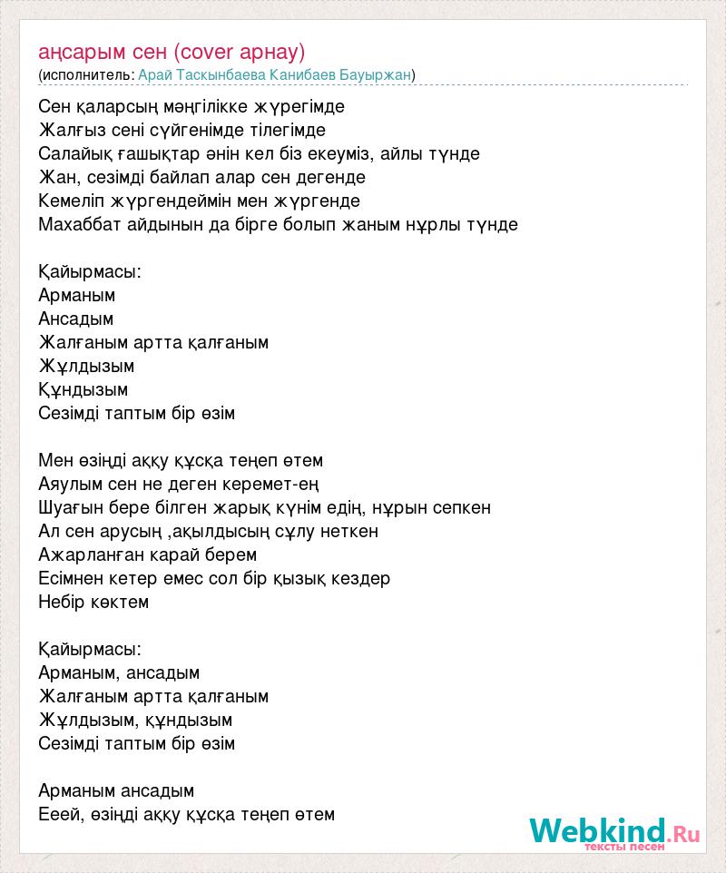 Cен қаларсың мәңгілікке жүрегімде Жалғыз сені сүйгенімде тілегімде Салайық ғашықтар әнін кел біз екеуміз, айлы түнде Жан, сезімді байлап алар сен дегенде Кемеліп жүргендеймін мен жүргенде Махаббат айдынын да бірге болып жаным нұрлы түнде Қайырмасы: Арманым Ансадым Жалғаным артта қалғаным Жұлдызым Құндызым Сезімді таптым бір өзім Мен өзіңді аққу құсқа теңеп өтем Аяулым сен не деген керемет-ең Шуағын бере білген жарық күнім едің, нұрын сепкен Ал сен арусың ,ақылдысың сұлу неткен Ажарланған карай берем Есімнен кетер емес сол бір қызық кездер Небір көктем Қайырмасы: Арманым, ансадым Жалғаным артта қалғаным Жұлдызым, құндызым Сезімді таптым бір өзім Арманым ансадым Ееей, өзіңді аққу құсқа теңеп өтем
