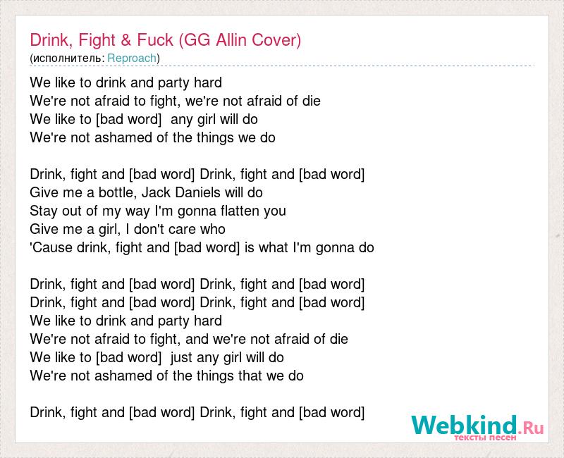 We like to drink and party hard We're not afraid to fight, we're not afraid of die We like to [bad word] any girl will do We're not ashamed of the things we do Drink, fight and [bad word] Drink, fight and [bad word] Give me a bottle, Jack Daniels will do Stay out of my way I'm gonna flatten you Give me a girl, I don't care who 'Cause drink, fight and [bad word] is what I'm gonna do Drink, fight and [bad word] Drink, fight and [bad word] Drink, fight and [bad word] Drink, fight and [bad word] We like to drink and party hard We're not afraid to fight, and we're not afraid of die We like to [bad word] just any girl will do We're not ashamed of the things that we do Drink, fight and [bad word] Drink, fight and [bad word]