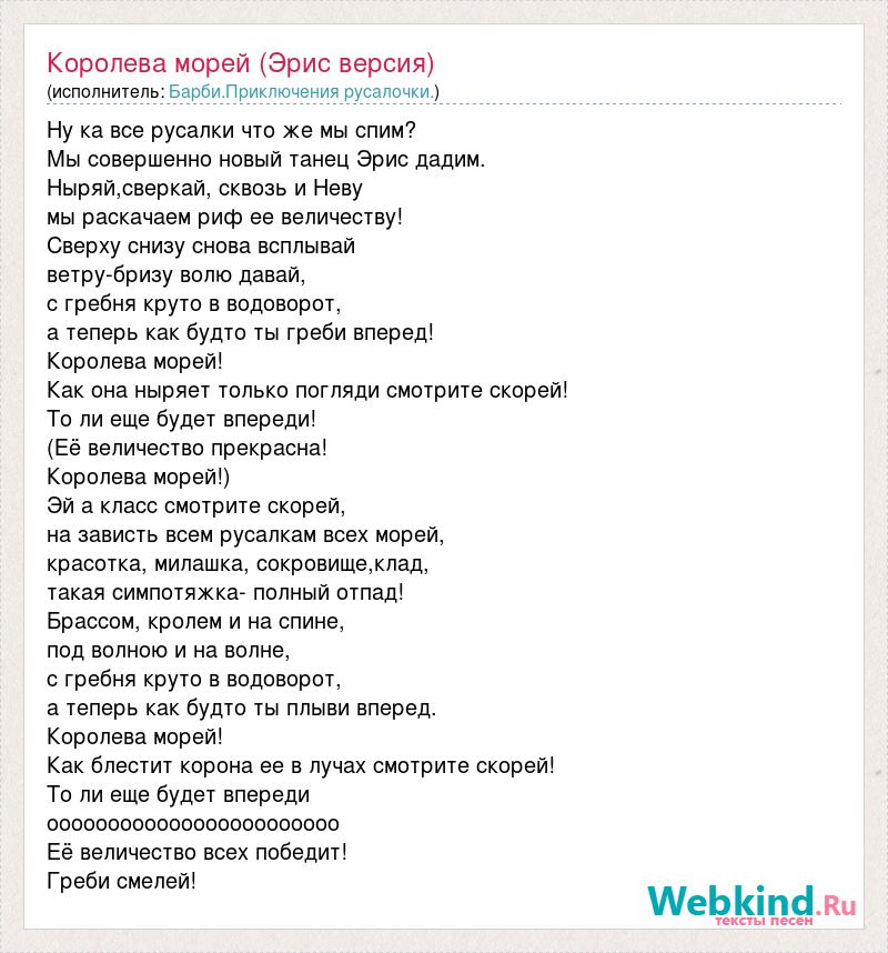 Ну ка все русалки что же мы спим? Мы совершенно новый танец Эрис дадим. Ныряй,сверкай, сквозь и Неву мы раскачаем риф ее величеству! Сверху снизу снова всплывай ветру-бризу волю давай, с гребня круто в водоворот, а теперь как будто ты греби вперед! Королева морей! Как она ныряет только погляди смотрите скорей! То ли еще будет впереди! (Её величество прекрасна! Королева морей!) Эй а класс смотрите скорей, на зависть всем русалкам всех морей, красотка, милашка, сокровище,клад, такая симпотяжка- полный отпад! Брассом, кролем и на спине, под волною и на волне, с гребня круто в водоворот, а теперь как будто ты плыви вперед. Королева морей! Как блестит корона ее в лучах смотрите скорей! То ли еще будет впереди оооооооооооооооооооооооо Её величество всех победит! Греби смелей!