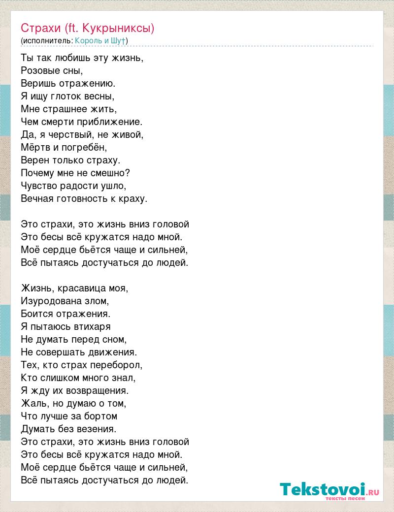 Ты так любишь эту жизнь, Розовые сны, Веришь отражению. Я ищу глоток весны, Мне страшнее жить, Чем смерти приближение. Да, я черствый, не живой, Мёртв и погребён, Верен только страху. Почему мне не смешно? Чувство радости ушло, Вечная готовность к краху. Это страхи, это жизнь вниз головой Это бесы всё кружатся надо мной. Моё сердце бьётся чаще и сильней, Всё пытаясь достучаться до людей. Жизнь, красавица моя, Изуродована злом, Боится отражения. Я пытаюсь втихаря Не думать перед сном, Не совершать движения. Тех, кто страх переборол, Кто слишком много знал, Я жду их возвращения. Жаль, но думаю о том, Что лучше за бортом Думать без везения. Это страхи, это жизнь вниз головой Это бесы всё кружатся надо мной. Моё сердце бьётся чаще и сильней, Всё пытаясь достучаться до людей.