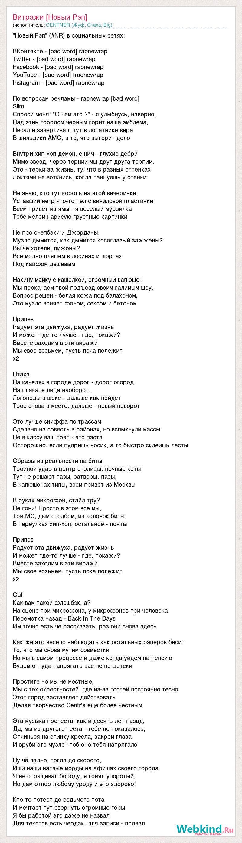 "Новый Рэп" (#NR) в социальных сетях: ВКонтакте - [bad word] rapnewrap Twitter - [bad word] rapnewrap Facebook - [bad word] rapnewrap YouTube - [bad word] truenewrap Instagram - [bad word] rapnewrap По вопросам рекламы - rapnewrap [bad word] Slim Спроси меня: "О чем это ?" - я улыбнусь, наверно, Над этим городом черным горит наша эмблема, Писал и зачеркивал, тут в лопатнике вера В шильдики AMG, в то, что выгорит дело Внутри хип-хоп демон, с ним - глухие дебри Мимо звезд, через тернии мы друг друга терпим, Это - терки за жизнь, ту, что в разных оттенках Локтями не воткнись, когда танцуешь у стенки Не знаю, кто тут король на этой вечеринке, Уставший негр что-то пел с виниловой пластинки Всем привет из ямы - я веселый мурзилка Тебе мелом нарисую грустные картинки Не про снэпбэки и Джорданы, Музло дымится, как дымится косоглазый зажженый Вы че хотели, пижоны? Все модно пляшем в лосинах и шортах Под кайфом дешевым Накину майку с кашелкой, огромный капюшон Мы прокачаем твой подъезд своим галимым шоу, Вопрос решен - белая кожа под балахоном, Это музло воняет фоном, сексом и бетоном Припев Радует эта движуха, радует жизнь И может где-то лучше - где, покажи? Вместе заходим в эти виражи Мы свое возьмем, пусть пока полежит x2 Птаха На качелях в городе дорог - дорог огород На плакате лица наоборот. Логопеды в шоке - дальше как пойдет Трое снова в месте, дальше - новый поворот Это лучше сниффа по трассам Сделано на совесть в районах, но вспыхнули массы Не в кассу ваш трэп - это паста Осторожно, если пудришь носик, а то быстро склеишь ласты Образы из реальности на биты Тройной удар в центр столицы, ночные коты Тут не решают тазы, затворы, пазы, В капюшонах типы, всем привет из Москвы В руках микрофон, стайл тру? Не гони! Просто в этом все мы, Три MC, дым столбом, из колонок биты В переулках хип-хоп, остальное - понты Припев Радует эта движуха, радует жизнь И может где-то лучше - где, покажи? Вместе заходим в эти виражи Мы свое возьмем, пусть пока полежит x2 Guf Как вам такой флешбэк, а? На сцене три микрофона, у микрофонов три человека Перемотка назад - Back In The Days Им точно есть че рассказать, раз они снова здесь Как же это весело наблюдать как остальных рэперов бесит То, что мы снова мутим совместки Но мы в самом процессе и даже когда уйдем на пенсию Будем оттуда напрягать вас не по-детски Простите но мы не местные, Мы с тех окрестностей, где из-за гостей постоянно тесно Этот город заставляет действовать Делая творчество Centr'a еще более честным Эта музыка протеста, как и десять лет назад, Да, мы из другого теста - тебе не показалось, Откинься на спинку кресла, закрой глаза И вруби это музло чтоб оно тебя напрягало Ну чё ладно, тогда до скорого, Ищи наши наглые морды на афишах своего города Я не отращивал бороду, я гонял упоротый, Но дам отпор любому уроду и это здорово! Кто-то потеет до седьмого пота И мечтает тут свернуть огромные горы Я бы работой это даже не назвал Для текстов есть чердак, для записи - подвал