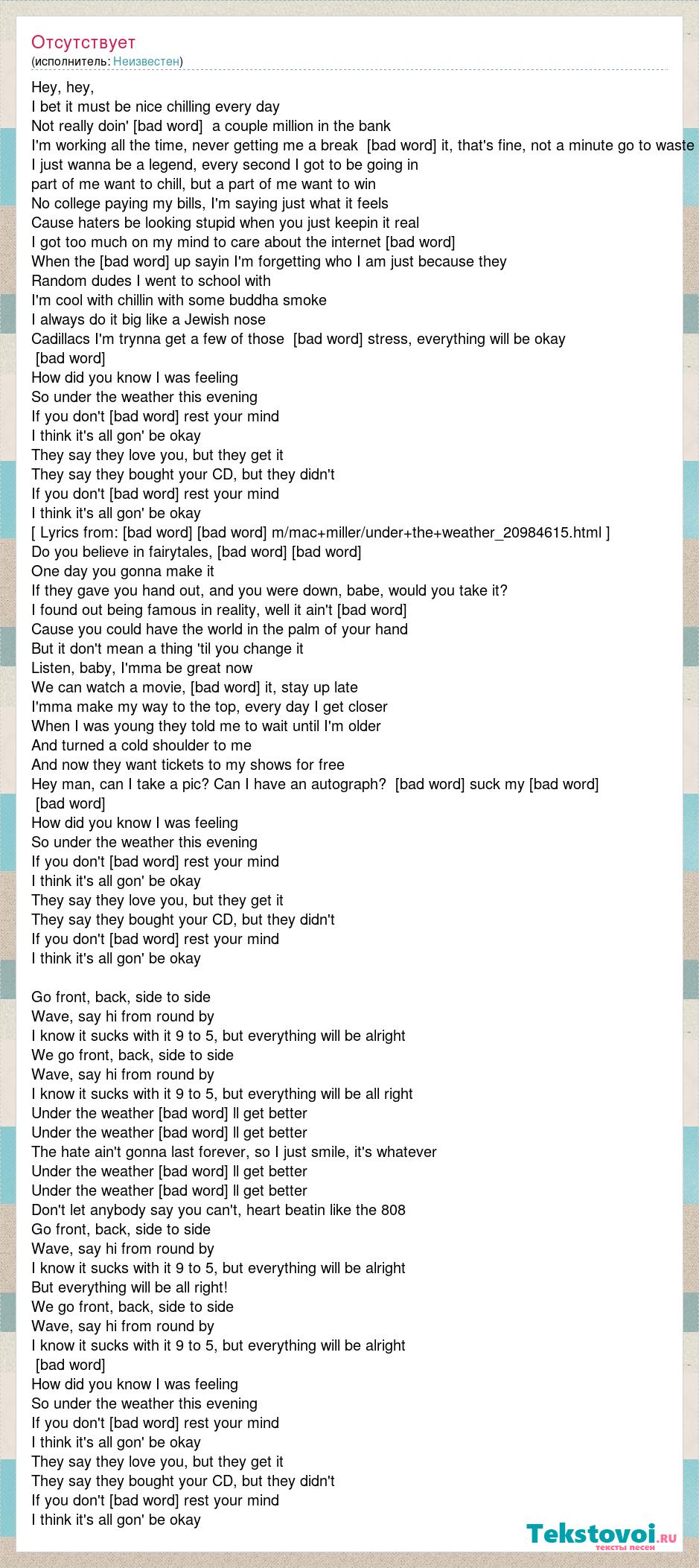 Hey, hey, I bet it must be nice chilling every day Not really doin' [bad word] a couple million in the bank I'm working all the time, never getting me a break [bad word] it, that's fine, not a minute go to waste I just wanna be a legend, every second I got to be going in part of me want to chill, but a part of me want to win No college paying my bills, I'm saying just what it feels Cause haters be looking stupid when you just keepin it real I got too much on my mind to care about the internet [bad word] When the [bad word] up sayin I'm forgetting who I am just because they Random dudes I went to school with I'm cool with chillin with some buddha smoke I always do it big like a Jewish nose Cadillacs I'm trynna get a few of those [bad word] stress, everything will be okay [bad word] How did you know I was feeling So under the weather this evening If you don't [bad word] rest your mind I think it's all gon' be okay They say they love you, but they get it They say they bought your CD, but they didn't If you don't [bad word] rest your mind I think it's all gon' be okay [ Lyrics from: [bad word] [bad word] m/mac+miller/under+the+weather_20984615.html ] Do you believe in fairytales, [bad word] [bad word] One day you gonna make it If they gave you hand out, and you were down, babe, would you take it? I found out being famous in reality, well it ain't [bad word] Cause you could have the world in the palm of your hand But it don't mean a thing 'til you change it Listen, baby, I'mma be great now We can watch a movie, [bad word] it, stay up late I'mma make my way to the top, every day I get closer When I was young they told me to wait until I'm older And turned a cold shoulder to me And now they want tickets to my shows for free Hey man, can I take a pic? Can I have an autograph? [bad word] suck my [bad word] [bad word] How did you know I was feeling So under the weather this evening If you don't [bad word] rest your mind I think it's all gon' be okay They say they love you, but they get it They say they bought your CD, but they didn't If you don't [bad word] rest your mind I think it's all gon' be okay Go front, back, side to side Wave, say hi from round by I know it sucks with it 9 to 5, but everything will be alright We go front, back, side to side Wave, say hi from round by I know it sucks with it 9 to 5, but everything will be all right Under the weather [bad word] ll get better Under the weather [bad word] ll get better The hate ain't gonna last forever, so I just smile, it's whatever Under the weather [bad word] ll get better Under the weather [bad word] ll get better Don't let anybody say you can't, heart beatin like the 808 Go front, back, side to side Wave, say hi from round by I know it sucks with it 9 to 5, but everything will be alright But everything will be all right! We go front, back, side to side Wave, say hi from round by I know it sucks with it 9 to 5, but everything will be alright [bad word] How did you know I was feeling So under the weather this evening If you don't [bad word] rest your mind I think it's all gon' be okay They say they love you, but they get it They say they bought your CD, but they didn't If you don't [bad word] rest your mind I think it's all gon' be okay