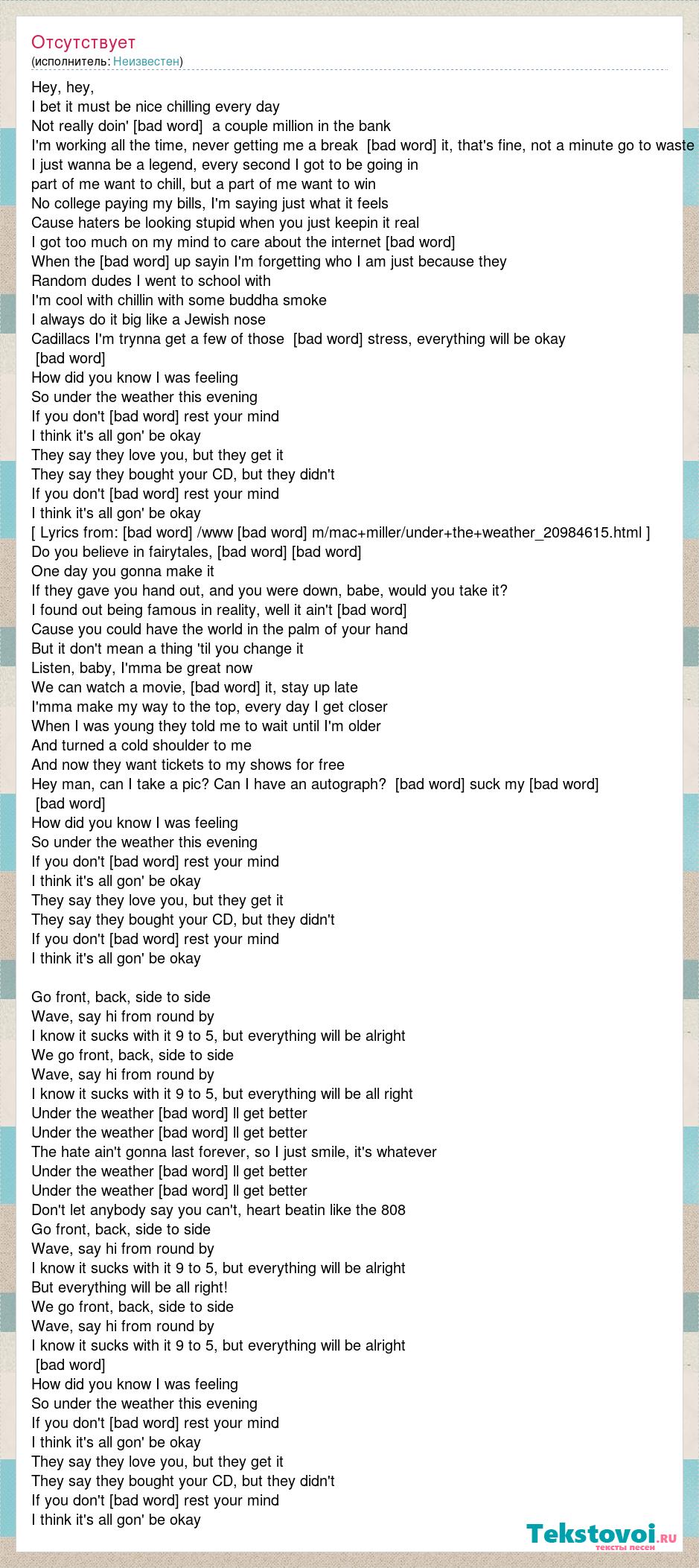 Hey, hey, I bet it must be nice chilling every day Not really doin' [bad word] a couple million in the bank I'm working all the time, never getting me a break [bad word] it, that's fine, not a minute go to waste I just wanna be a legend, every second I got to be going in part of me want to chill, but a part of me want to win No college paying my bills, I'm saying just what it feels Cause haters be looking stupid when you just keepin it real I got too much on my mind to care about the internet [bad word] When the people coming up sayin I'm forgetting who I am just because they Random dudes I went to school with I'm cool with chillin with some buddha smoke I always do it big like a Jewish nose Cadillacs I'm trynna get a few of those [bad word] stress, everything will be okay Chorus: How did you know I was feeling So under the weather this evening If you don't mind, come rest your mind I think it's all gon' be okay They say they love you, but they get it They say they bought your CD, but they didn't If you don't mind, come rest your mind I think it's all gon' be okay [ Lyrics from: [bad word] /www [bad word] m/mac+miller/under+the+weather_20984615.html ] Do you believe in fairytales, dreams come true? One day you gonna make it If they gave you hand out, and you were down, babe, would you take it? I found out being famous in reality, well it ain't [bad word] Cause you could have the world in the palm of your hand But it don't mean a thing 'til you change it Listen, baby, I'mma be great now We can watch a movie, [bad word] it, stay up late I'mma make my way to the top, every day I get closer When I was young they told me to wait until I'm older And turned a cold shoulder to me And now they want tickets to my shows for free Hey man, can I take a pic? Can I have an autograph? [bad word] suck my [bad word] Chorus: How did you know I was feeling So under the weather this evening If you don't mind, come rest your mind I think it's all gon' be okay They say they love you, but they get it They say they bought your CD, but they didn't If you don't mind, come rest your mind I think it's all gon' be okay Go front, back, side to side Wave, say hi from round by I know it sucks with it 9 to 5, but everything will be alright We go front, back, side to side Wave, say hi from round by I know it sucks with it 9 to 5, but everything will be all right Under the weather [bad word] ll get better Under the weather [bad word] ll get better The hate ain't gonna last forever, so I just smile, it's whatever Under the weather [bad word] ll get better Under the weather [bad word] ll get better Don't let anybody say you can't, heart beatin like the 808 Go front, back, side to side Wave, say hi from round by I know it sucks with it 9 to 5, but everything will be alright But everything will be all right! We go front, back, side to side Wave, say hi from round by I know it sucks with it 9 to 5, but everything will be alright Chorus: How did you know I was feeling So under the weather this evening If you don't mind, come rest your mind I think it's all gon' be okay They say they love you, but they get it They say they bought your CD, but they didn't If you don't mind, come rest your mind I think it's all gon' be okay
