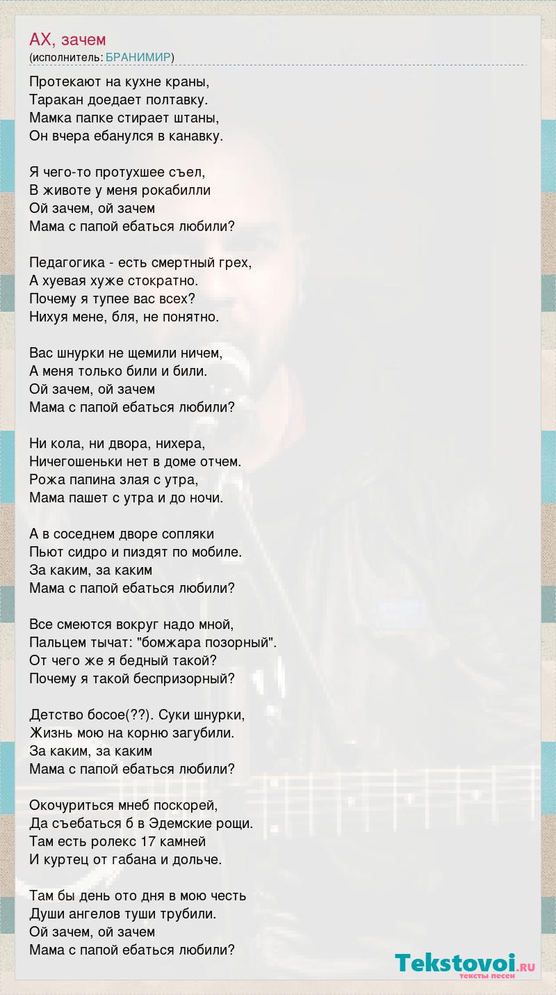 Протекают на кухне краны, Таракан доедает полтавку. Мамка папке стирает штаны, Он вчера ебанулся в канавку. Я чего-то протухшее съел, В животе у меня рокабилли Ой зачем, ой зачем Мама с папой ебаться любили? Педагогика - есть смертный грех, А хуевая хуже стократно. Почему я тупее вас всех? Нихуя мене, бля, не понятно. Вас шнурки не щемили ничем, А меня только били и били. Ой зачем, ой зачем Мама с папой ебаться любили? Ни кола, ни двора, нихера, Ничегошеньки нет в доме отчем. Рожа папина злая с утра, Мама пашет с утра и до ночи. А в соседнем дворе сопляки Пьют сидро и пиздят по мобиле. За каким, за каким Мама с папой ебаться любили? Все смеются вокруг надо мной, Пальцем тычат: "бомжара позорный". От чего же я бедный такой? Почему я такой беспризорный? Детство босое(??). Суки шнурки, Жизнь мою на корню загубили. За каким, за каким Мама с папой ебаться любили? Окочуриться мнеб поскорей, Да съебаться б в Эдемские рощи. Там есть ролекс 17 камней И куртец от габана и дольче. Там бы день ото дня в мою честь Души ангелов туши трубили. Ой зачем, ой зачем Мама с папой ебаться любили?