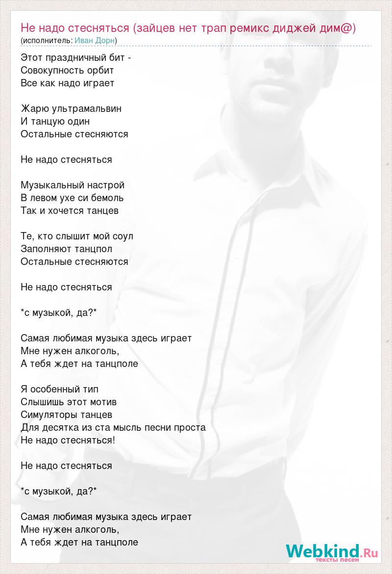 Этот праздничный бит - Совокупность орбит Все как надо играет Жарю ультрамальвин И танцую один Остальные стесняются Не надо стесняться Музыкальный настрой В левом ухе си бемоль Так и хочется танцев Те, кто слышит мой соул Заполняют танцпол Остальные стесняются Не надо стесняться *с музыкой, да?* Самая любимая музыка здесь играет Мне нужен алкоголь, А тебя ждет на танцполе Я особенный тип Слышишь этот мотив Симуляторы танцев Для десятка из ста мысль песни проста Не надо стесняться! Не надо стесняться *с музыкой, да?* Самая любимая музыка здесь играет Мне нужен алкоголь, А тебя ждет на танцполе