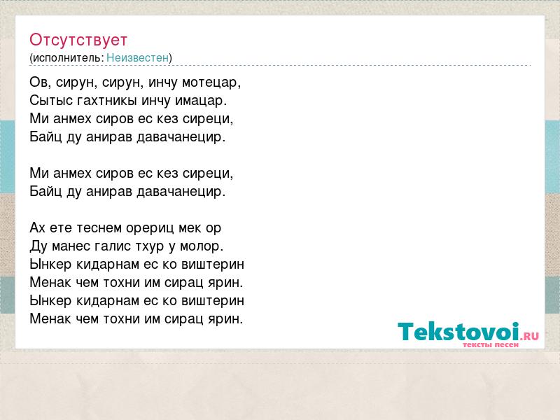 Ов, сирун, сирун, инчу мотецар, Сытыс гахтникы инчу имацар. Ми анмех сиров ес кез сиреци, Байц ду анирав давачанецир. Ми анмех сиров ес кез сиреци, Байц ду анирав давачанецир. Ах ете теснем орериц мек ор Ду манес галис тхур у молор. Ынкер кидарнам ес ко виштерин Менак чем тохни им сирац ярин. Ынкер кидарнам ес ко виштерин Менак чем тохни им сирац ярин.