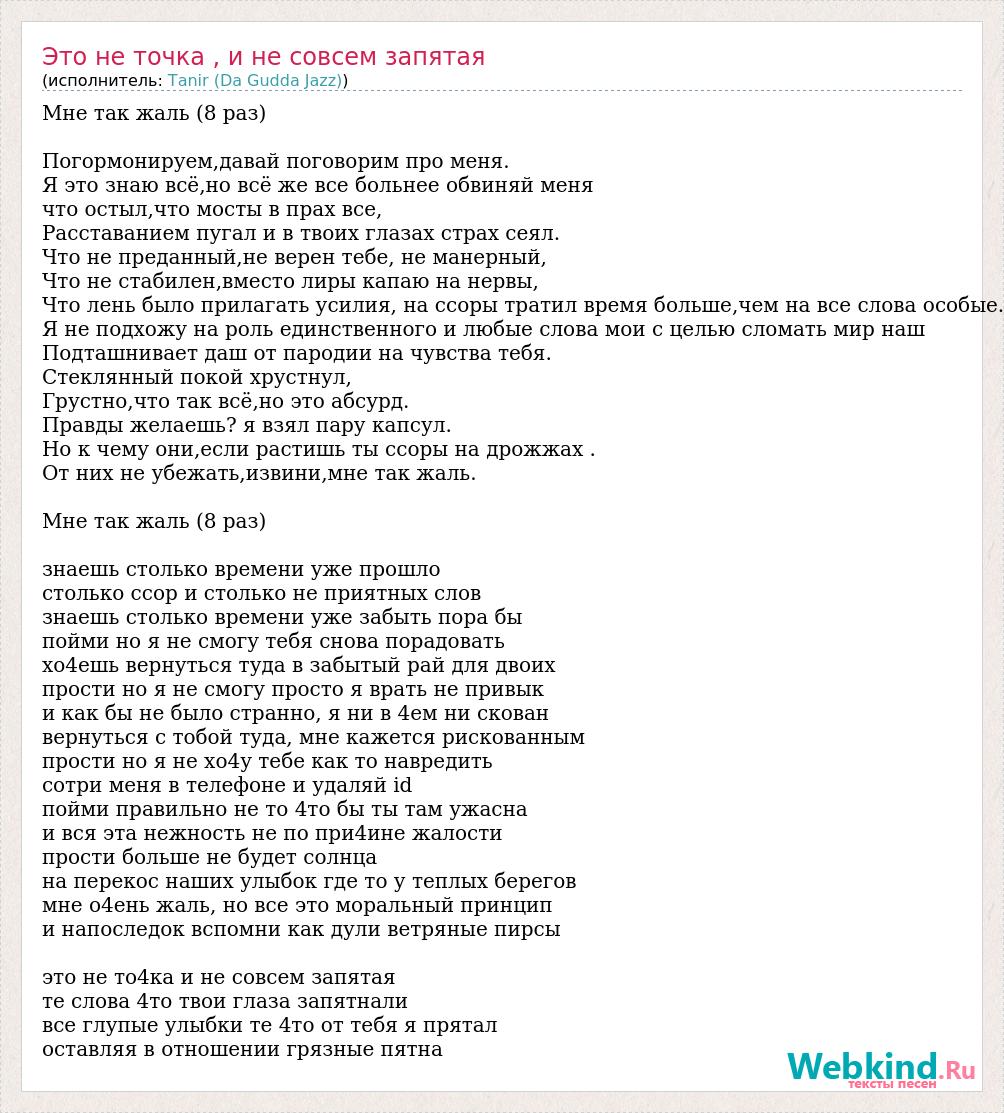 Мне так жаль (8 раз) Погормонируем,давай поговорим про меня. Я это знаю всё,но всё же все больнее обвиняй меня что остыл,что мосты в прах все, Расставанием пугал и в твоих глазах страх сеял. Что не преданный,не верен тебе, не манерный, Что не стабилен,вместо лиры капаю на нервы, Что лень было прилагать усилия, на ссоры тратил время больше,чем на все слова особые. Я не подхожу на роль единственного и любые слова мои с целью сломать мир наш Подташнивает даш от пародии на чувства тебя. Стеклянный покой хрустнул, Грустно,что так всё,но это абсурд. Правды желаешь? я взял пару капсул. Но к чему они,если растишь ты ссоры на дрожжах . От них не убежать,извини,мне так жаль. Мне так жаль (8 раз) знаешь столько времени уже прошло столько ссор и столько не приятных слов знаешь столько времени уже забыть пора бы пойми но я не смогу тебя снова порадовать хо4ешь вернуться туда в забытый рай для двоих прости но я не смогу просто я врать не привык и как бы не было странно, я ни в 4ем ни скован вернуться с тобой туда, мне кажется рискованным прости но я не хо4у тебе как то навредить сотри меня в телефоне и удаляй id пойми правильно не то 4то бы ты там ужасна и вся эта нежность не по при4ине жалости прости больше не будет солнца на перекос наших улыбок где то у теплых берегов мне о4ень жаль, но все это моральный принцип и напоследок вспомни как дули ветряные пирсы это не то4ка и не совсем запятая те слова 4то твои глаза запятнали все глупые улыбки те 4то от тебя я прятал оставляя в отношении грязные пятна