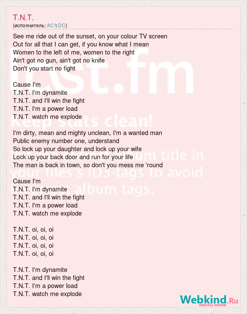See me ride out of the sunset, on your colour TV screen Out for all that I can get, if you know what I mean Women to the left of me, women to the right Ain't got no gun, ain't got no knife Don't you start no fight Cause I'm T.N.T. I'm dynamite T.N.T. and I'll win the fight T.N.T. I'm a power load T.N.T. watch me explode I'm dirty, mean and mighty unclean, I'm a wanted man Public enemy number one, understand So lock up your daughter and lock up your wife Lock up your back door and run for your life The man is back in town, so don't you mess me 'round Cause I'm T.N.T. I'm dynamite T.N.T. and I'll win the fight T.N.T. I'm a power load T.N.T. watch me explode T.N.T. oi, oi, oi T.N.T. oi, oi, oi T.N.T. oi, oi, oi T.N.T. oi, oi, oi T.N.T. I'm dynamite T.N.T. and I'll win the fight T.N.T. I'm a power load T.N.T. watch me explode