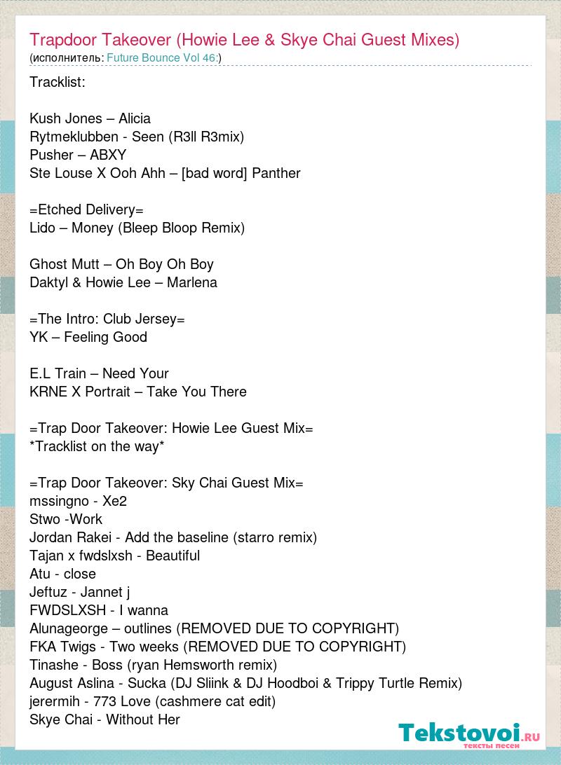 Tracklist: Kush Jones – Alicia Rytmeklubben - Seen (R3ll R3mix) Pusher – ABXY Ste Louse X Ooh Ahh – [bad word] Panther =Etched Delivery= Lido – Money (Bleep Bloop Remix) Ghost Mutt – Oh Boy Oh Boy Daktyl & Howie Lee – Marlena =The Intro: Club Jersey= YK – Feeling Good E.L Train – Need Your KRNE X Portrait – Take You There =Trap Door Takeover: Howie Lee Guest Mix= *Tracklist on the way* =Trap Door Takeover: Sky Chai Guest Mix= mssingno - Xe2 Stwo -Work Jordan Rakei - Add the baseline (starro remix) Tajan x fwdslxsh - Beautiful Atu - close Jeftuz - Jannet j FWDSLXSH - I wanna Alunageorge – outlines (REMOVED DUE TO COPYRIGHT) FKA Twigs - Two weeks (REMOVED DUE TO COPYRIGHT) Tinashe - Boss (ryan Hemsworth remix) August Aslina - Sucka (DJ Sliink & DJ Hoodboi & Trippy Turtle Remix) jerermih - 773 Love (cashmere cat edit) Skye Chai - Without Her
