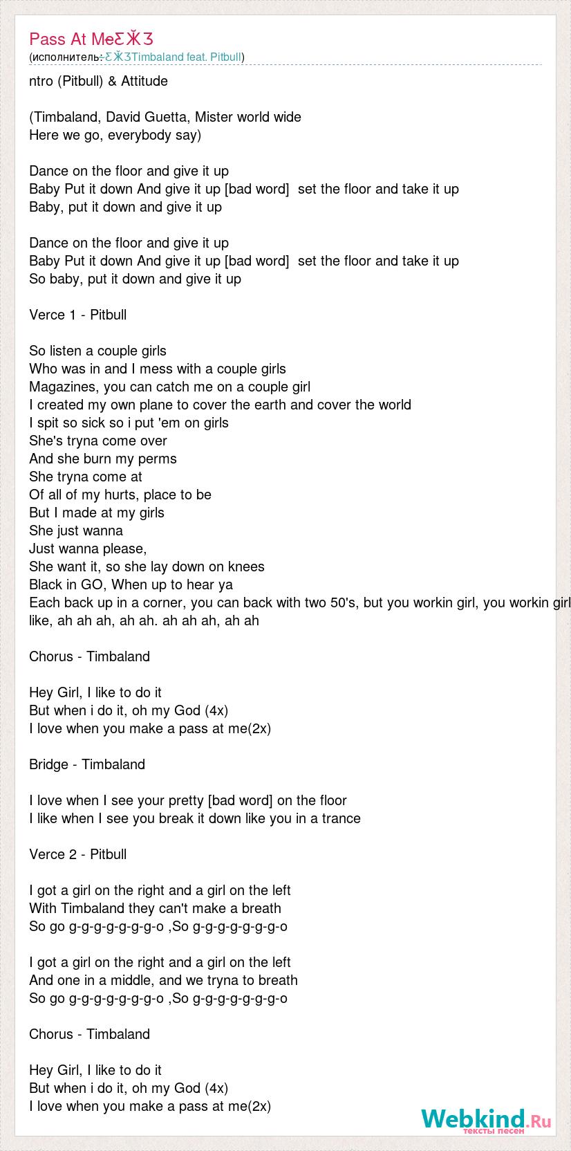 ntro (Pitbull) & Attitude (Timbaland, David Guetta, Mister world wide Here we go, everybody say) Dance on the floor and give it up Baby Put it down And give it up [bad word] set the floor and take it up Baby, put it down and give it up Dance on the floor and give it up Baby Put it down And give it up [bad word] set the floor and take it up So baby, put it down and give it up Verce 1 - Pitbull So listen a couple girls Who was in and I mess with a couple girls Magazines, you can catch me on a couple girl I created my own plane to cover the earth and cover the world I spit so sick so i put 'em on girls She's tryna come over And she burn my perms She tryna come at Of all of my hurts, place to be But I made at my girls She just wanna Just wanna please, She want it, so she lay down on knees Black in GO, When up to hear ya Each back up in a corner, you can back with two 50's, but you workin girl, you workin girl like, ah ah ah, ah ah. ah ah ah, ah ah Chorus - Timbaland Hey Girl, I like to do it But when i do it, oh my God (4x) I love when you make a pass at me(2x) Bridge - Timbaland I love when I see your pretty [bad word] on the floor I like when I see you break it down like you in a trance Verce 2 - Pitbull I got a girl on the right and a girl on the left With Timbaland they can't make a breath So go g-g-g-g-g-g-g-o ,So g-g-g-g-g-g-g-o I got a girl on the right and a girl on the left And one in a middle, and we tryna to breath So go g-g-g-g-g-g-g-o ,So g-g-g-g-g-g-g-o Chorus - Timbaland Hey Girl, I like to do it But when i do it, oh my God (4x) I love when you make a pass at me(2x)