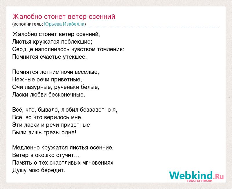 Жалобно стонет ветер осенний, Листья кружатся поблекшие; Сердце наполнилось чувством томления: Помнится счастье утекшее. Помнятся летние ночи веселые, Нежные речи приветные, Очи лазурные, рученьки белые, Ласки любви бесконечные. Всё, что, бывало, любил беззаветно я, Всё, во что верилось мне, Эти ласки и речи приветные Были лишь грезы одне! Медленно кружатся листья осенние, Ветер в окошко стучит… Память о тех счастливых мгновениях Душу мою бередит.