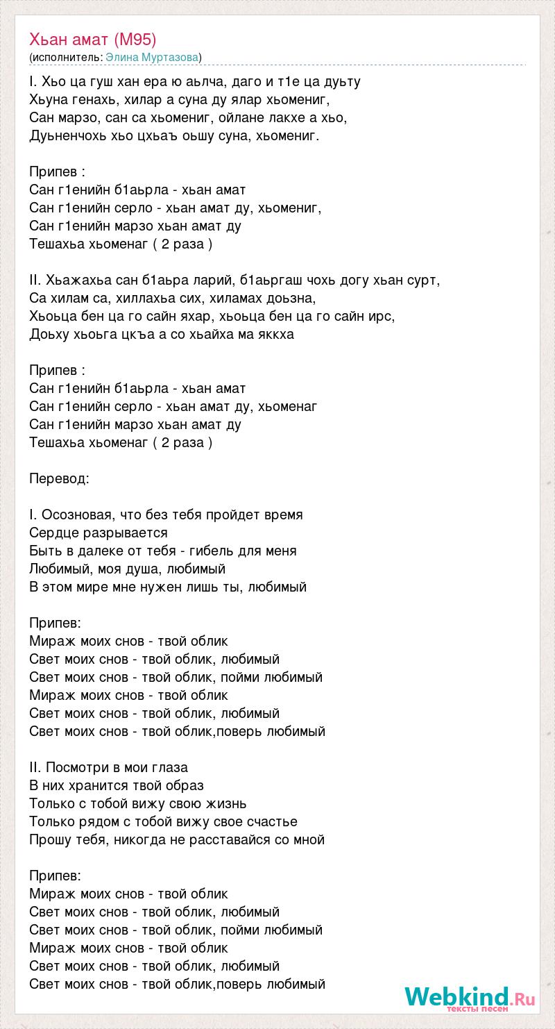 I. Хьо ца гуш хан ера ю аьлча, даго и т1е ца дуьту Хьуна генахь, хилар а суна ду ялар хьомениг, Сан марзо, сан са хьомениг, ойлане лакхе а хьо, Дуьненчохь хьо цхьаъ оьшу суна, хьомениг. Припев : Сан г1енийн б1аьрла - хьан амат Сан г1енийн серло - хьан амат ду, хьомениг, Сан г1енийн марзо хьан амат ду Тешахьа хьоменаг ( 2 раза ) II. Хьажахьа сан б1аьра ларий, б1аьргаш чохь догу хьан сурт, Са хилам са, хиллахьа сих, хиламах доьзна, Хьоьца бен ца го сайн яхар, хьоьца бен ца го сайн ирс, Доьху хьоьга цкъа а со хьайха ма яккха Припев : Сан г1енийн б1аьрла - хьан амат Сан г1енийн серло - хьан амат ду, хьоменаг Сан г1енийн марзо хьан амат ду Тешахьа хьоменаг ( 2 раза ) Перевод: I. Осозновая, что без тебя пройдет время Сердце разрывается Быть в далеке от тебя - гибель для меня Любимый, моя душа, любимый В этом мире мне нужен лишь ты, любимый Припев: Мираж моих снов - твой облик Свет моих снов - твой облик, любимый Свет моих снов - твой облик, пойми любимый Мираж моих снов - твой облик Свет моих снов - твой облик, любимый Свет моих снов - твой облик,поверь любимый II. Посмотри в мои глаза В них хранится твой образ Только с тобой вижу свою жизнь Только рядом с тобой вижу свое счастье Прошу тебя, никогда не расставайся со мной Припев: Мираж моих снов - твой облик Свет моих снов - твой облик, любимый Свет моих снов - твой облик, пойми любимый Мираж моих снов - твой облик Свет моих снов - твой облик, любимый Свет моих снов - твой облик,поверь любимый