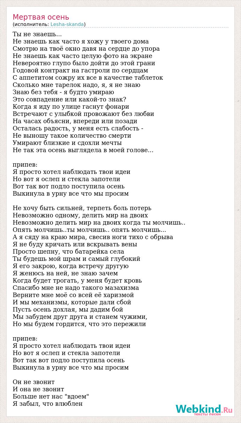 Ты не знаешь... Не знаешь как часто я хожу у твоего дома Смотрю на твоё окно давя на сердце до упора Не знаешь как часто целую фото на экране Невероятно глупо было дойти до этой грани Годовой контракт на гастроли по сердцам С аппетитом сожру их все в качестве таблеток Сколько мне тарелок надо, я, я не знаю Знаю без тебя - я будто умираю Это совпадение или какой-то знак? Когда я иду по улице гаснут фонари Встречают с улыбкой провожают без любви На часах объясни, впереди или позади Осталась радость, у меня есть слабость - Не выношу такое количество смерти Умирают близкие и сдохли мечты Не так эта осень выглядела в моей голове... припев: Я просто хотел наблюдать твои идеи Но вот я ослеп и стекла запотели Вот так вот подло поступила осень Выкинула в урну все что мы просим Не хочу быть сильней, терпеть боль потерь Невозможно одному, делить мир на двоих Невозможно делить мир на двоих когда ты молчишь.. Опять молчишь..ты молчишь.. опять молчишь... А я сяду на краю мира, свесив ноги тихо с обрыва Я не буду кричать или вскрывать вены Просто шепну, что батарейка села Ты будешь мой шрам и самый глубокий Я его закрою, когда встречу другую Я женюсь на ней, не знаю зачем Когда будет трогать, у меня будет кровь Спасибо мне не надо такого мазахизма Верните мне моё со всей её харизмой И мы механизмы, которые дали сбой Пусть осень дохлая, мы дадим бой Мы забудем друг друга и станем чужими, Но мы будем гордится, что это пережили припев: Я просто хотел наблюдать твои идеи Но вот я ослеп и стекла запотели Вот так вот подло поступила осень Выкинула в урну все что мы просим Он не звонит И она не звонит Больше нет нас "вдоем" Я забыл, что влюблен