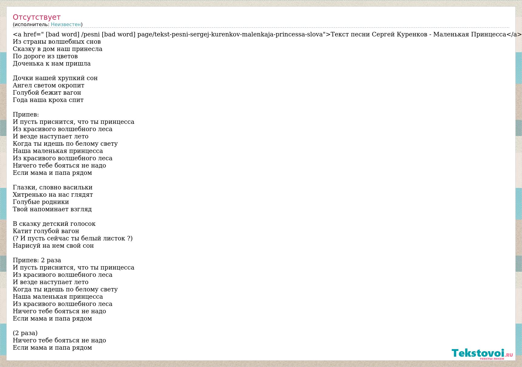 <a href=" [bad word] /pesni [bad word] page/tekst-pesni-sergej-kurenkov-malenkaja-princessa-slova">Текст песни Сергей Куренков - Маленькая Принцесса</a> Из страны волшебных снов Сказку в дом наш принесла По дороге из цветов Доченька к нам пришла Дочки нашей хрупкий сон Ангел светом окропит Голубой бежит вагон Года наша кроха спит Припев: И пусть приснится, что ты принцесса Из красивого волшебного леса И везде наступает лето Когда ты идешь по белому свету Наша маленькая принцесса Из красивого волшебного леса Ничего тебе бояться не надо Если мама и папа рядом Глазки, словно васильки Хитренько на нас глядят Голубые родники Твой напоминает взгляд В сказку детский голосок Катит голубой вагон (? И пусть сейчас ты белый листок ?) Нарисуй на нем свой сон Припев: 2 раза И пусть приснится, что ты принцесса Из красивого волшебного леса И везде наступает лето Когда ты идешь по белому свету Наша маленькая принцесса Из красивого волшебного леса Ничего тебе бояться не надо Если мама и папа рядом (2 раза) Ничего тебе бояться не надо Если мама и папа рядом