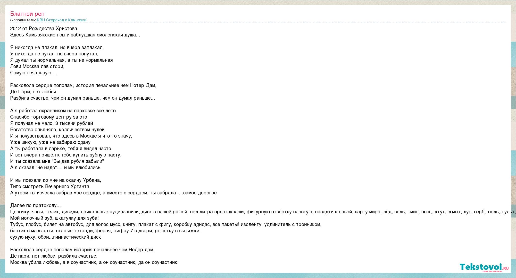2012 от Рождества Христова Здесь Камызякские псы и заблудшая смоленская душа... Я никогда не плакал, но вчера заплакал, Я никогда не путал, но вчера попутал, Я думал ты нормальная, а ты не нормальная Лови Москва лав стори, Самую печальную.... Расколола сердце пополам, история печальнее чем Нотер Дам, Де Пари, нет любви Разбила счастье, чем он думал раньше, чем он думал раньше... А я работал охранником на парковке всё лето Спасибо торговому центру за это Я получал не мало, 3 тысячи рублей Богатство опьяняло, колличеством нулей И я почувствовал, что здесь в Москве я что-то значу, Уже шикую, уже не забираю сдачу А ты работала в ларьке, тебя я видел часто И вот вчера пришёл к тебе купить зубную пасту, И ты сказала мне "Вы два рубля забыли" А я сказал "не надо".... и мы влюбились И мы поехали ко мне на окаину Урбана, Типо смотреть Вечернего Урганта, А утром ты исчезла забрав моё сердце, а вместе с сердцем, ты забрала ....самое дорогое Далее по пратоколу... Цепочку, часы, телик, дивиди, прикольные аудиозаписи, диск с нашей рашей, пол литра простакваши, фигурную отвёртку плоскую, насадки к новой, карту мира, лёд, соль, тмин, нож, жгут, жмых, лук, герб, тюль, пульт, Мой молочный зуб, шкатулку для зуба! Тубус, глобус, билет на автобус, для волос мусс, книгу, плакат с фигу, коробку адидас, все пакеты! изоленту, удлинитель с тройником, бантик с мазырати, старые тетради, ферзя, цифру 7 с двери, решётку с вытяжки, сухую муху, обои...гимнастический диск Расколола сердце пополам история печальнее чем Нодер дам, Де пари, нет любви, разбила счастье, Москва убила любовь, а я соучастник, а он соучастник, да он соучастник