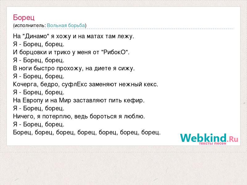 На "Динамо" я хожу и на матах там лежу. Я - Борец, борец. И борцовки и трико у меня от "РибокО". Я - Борец, борец. В ноги быстро прохожу, на диете я сижу. Я - Борец, борец. Кочерга, бедро, суфлЕкс заменяют нежный кекс. Я - Борец, борец. На Европу и на Мир заставляют пить кефир. Я - Борец, борец. Ничего, я потерплю, ведь бороться я люблю. Я - Борец, борец. Борец, борец, борец, борец, борец, борец, борец.