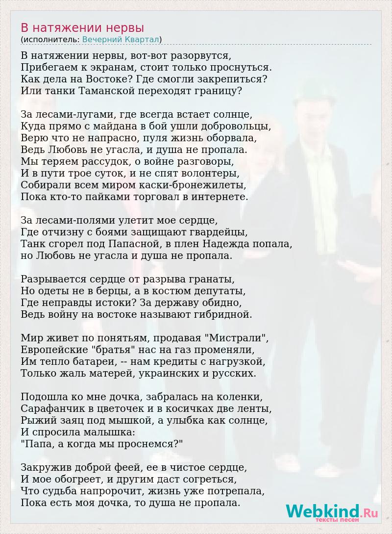 В натяжении нервы, вот-вот разорвутся, Прибегаем к экранам, стоит только проснуться. Как дела на Востоке? Где смогли закрепиться? Или танки Таманской переходят границу? За лесами-лугами, где всегда встает солнце, Куда прямо с майдана в бой ушли добровольцы, Верю что не напрасно, пуля жизнь оборвала, Ведь Любовь не угасла, и душа не пропала. Мы теряем рассудок, о войне разговоры, И в пути трое суток, и не спят волонтеры, Собирали всем миром каски-бронежилеты, Пока кто-то пайками торговал в интернете. За лесами-полями улетит мое сердце, Где отчизну с боями защищают гвардейцы, Танк сгорел под Папасной, в плен Надежда попала, но Любовь не угасла и душа не пропала. Разрывается сердце от разрыва гранаты, Но одеты не в берцы, а в костюм депутаты, Где неправды истоки? За державу обидно, Ведь войну на востоке называют гибридной. Мир живет по понятьям, продавая "Мистрали", Европейские "братья" нас на газ променяли, Им тепло батареи, -- нам кредиты с нагрузкой, Только жаль матерей, украинских и русских. Подошла ко мне дочка, забралась на коленки, Сарафанчик в цветочек и в косичках две ленты, Рыжий заяц под мышкой, а улыбка как солнце, И спросила малышка: "Папа, а когда мы проснемся?" Закружив доброй феей, ее в чистое сердце, И мое обогреет, и другим даст согреться, Что судьба напророчит, жизнь уже потрепала, Пока есть моя дочка, то душа не пропала.