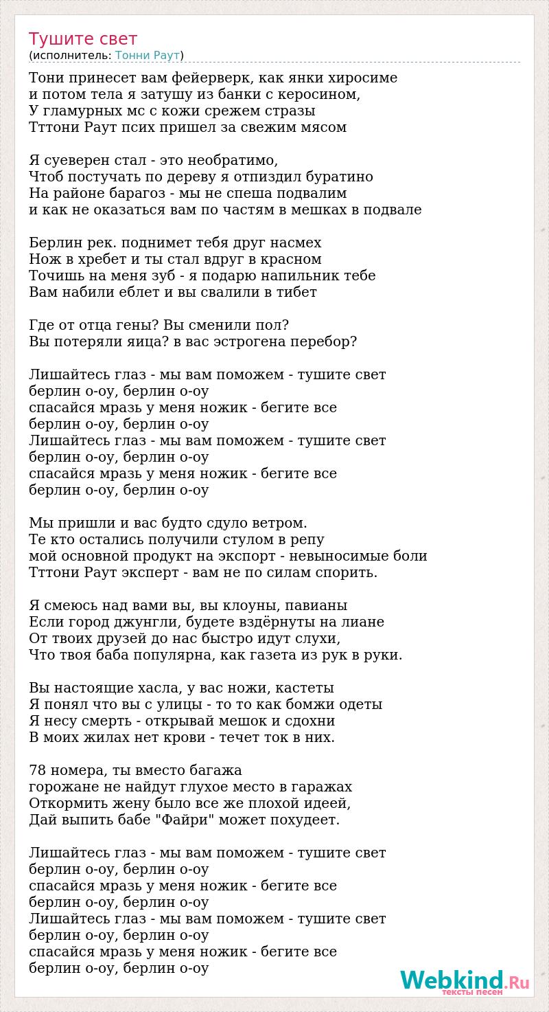 Тони принесет вам фейерверк, как янки хиросиме и потом тела я затушу из банки с керосином, У гламурных мс с кожи срежем стразы Тттони Раут псих пришел за свежим мясом Я суеверен стал - это необратимо, Чтоб постучать по дереву я отпиздил буратино На районе барагоз - мы не спеша подвалим и как не оказаться вам по частям в мешках в подвале Берлин рек. поднимет тебя друг насмех Нож в хребет и ты стал вдруг в красном Точишь на меня зуб - я подарю напильник тебе Вам набили еблет и вы свалили в тибет Где от отца гены? Вы сменили пол? Вы потеряли яица? в вас эстрогена перебор? Лишайтесь глаз - мы вам поможем - тушите свет берлин о-оу, берлин о-оу спасайся мразь у меня ножик - бегите все берлин о-оу, берлин о-оу Лишайтесь глаз - мы вам поможем - тушите свет берлин о-оу, берлин о-оу спасайся мразь у меня ножик - бегите все берлин о-оу, берлин о-оу Мы пришли и вас будто сдуло ветром. Те кто остались получили стулом в репу мой основной продукт на экспорт - невыносимые боли Тттони Раут эксперт - вам не по силам спорить. Я смеюсь над вами вы, вы клоуны, павианы Если город джунгли, будете вздёрнуты на лиане От твоих друзей до нас быстро идут слухи, Что твоя баба популярна, как газета из рук в руки. Вы настоящие хасла, у вас ножи, кастеты Я понял что вы с улицы - то то как бомжи одеты Я несу смерть - открывай мешок и сдохни В моих жилах нет крови - течет ток в них. 78 номера, ты вместо багажа горожане не найдут глухое место в гаражах Откормить жену было все же плохой идеей, Дай выпить бабе "Файри" может похудеет. Лишайтесь глаз - мы вам поможем - тушите свет берлин о-оу, берлин о-оу спасайся мразь у меня ножик - бегите все берлин о-оу, берлин о-оу Лишайтесь глаз - мы вам поможем - тушите свет берлин о-оу, берлин о-оу спасайся мразь у меня ножик - бегите все берлин о-оу, берлин о-оу