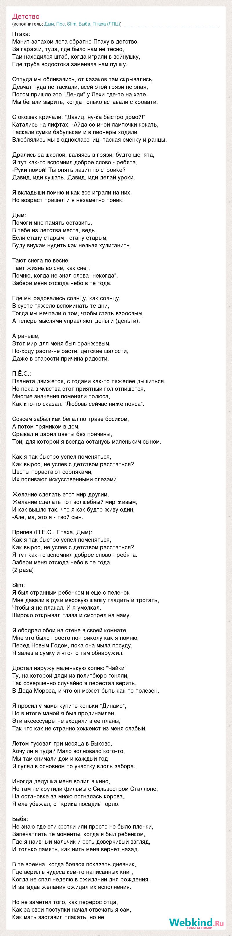 Птаха: Манит запахом лета обратно Птаху в детство, За гаражи, туда, где было нам не тесно, Там находился штаб, когда играли в войнушку, Где труба водостока заменяла нам пушку. Оттуда мы обливались, от казаков там скрывались, Девчат туда не таскали, всей этой грязи не зная, Потом пришло это "Денди" у Лехи где-то на хате, Мы бегали зырить, когда только вставали с кровати. С окошек кричали: "Давид, ну-ка быстро домой!" Катались на лифтах. -Айда со мной лампочки кокать, Таскали сумки бабулькам и в пионеры ходили, Влюблялись мы в одноклассниц, таская сменку и ранцы. Дрались за школой, валяясь в грязи, будто щенята, Я тут как-то вспомнил доброе слово - ребята, -Руки помой! Ты опять лазил по строике? Давид, иди кушать. Давид, иди делай уроки. Я вкладыши помню и как все играли на них, Но возраст пришел и я незаметно поник. Дым: Помоги мне память оставить, В тебе из детства места, ведь, Если стану старым - стану старым, Буду внукам нудить как нельзя хулиганить. Тают снега по весне, Тает жизнь во сне, как снег, Помню, когда не знал слова "некогда", Забери меня отсюда небо в те года. Где мы радовались солнцу, как солнцу, В суете тяжело вспоминать те дни, Тогда мы мечтали о том, чтобы стать взрослым, А теперь мыслями управляют деньги (деньги). А раньше, Этот мир для меня был оранжевым, По-ходу расти-не расти, детские шалости, Даже в старости причина радости. П.Ё.С.: Планета движется, с годами как-то тяжелее дышиться, Но пока в чувства этот приятный гол отпишется, Многие значения поменяли полюса, Как кто-то сказал: "Любовь сейчас ниже пояса". Совсем забыл как бегал по траве босиком, А потом прямиком в дом, Срывал и дарил цветы без причины, Той, для которой я всегда останусь маленьким сыном. Как я так быстро успел поменяться, Как вырос, не успев с детством расстаться? Цветы порастают сорняками, Их поливают искусственными слезами. Желание сделать этот мир другим, Желание сделать тот волшебный мир живым, И как вышло так, что я как будто живу один, -Алё, ма, это я - твой сын. Припев (П.Ё.С., Птаха, Дым): Как я так быстро успел поменяться, Как вырос, не успев с детством расстаться? Я тут как-то вспомнил доброе слово - ребята. Забери меня отсюда небо в те года. (2 раза) Slim: Я был странным ребенком и еще с пеленок Мне давали в руки меховую шапку гладить и трогать, Чтобы я не плакал. И я умолкал, Широко открывал глаза и смотрел на маму. Я ободрал обои на стене в своей комнате, Мне это было просто по-приколу как я помню, Перед Новым Годом, пока она мыла посуду, Я залез в сумку и что-то там обнаружил. Достал наружу маленькую копию "Чайки" Ту, на которой дяди из политбюро гоняли, Так совершенно случайно я перестал верить, В Деда Мороза, и что он может быть как-то полезен. Я просил у мамы купить коньки "Динамо", Но в итоге мамой я был продинамлен, Эти аксессуары не входили в ее планы, Так что как не странно хоккеист из меня слабый. Летом тусовал три месяца в Быково, Хочу ли я туда? Мало волновало кого-то, Мы там снимали дом и каждый год Я гулял в основном по участку вдоль забора. Иногда дедушка меня водил в кино, Но там не крутили фильмы с Сильвестром Сталлоне, На остановке за мною погналась корова, Я еле убежал, от крика посадив горло. Быба: Не знаю где эти фотки или просто не было пленки, Запечатлить те моменты, когда я был ребенком, Где я наивный мальчик и есть доверчивый взгляд, И только память, как нить меня вернет назад. В те вре