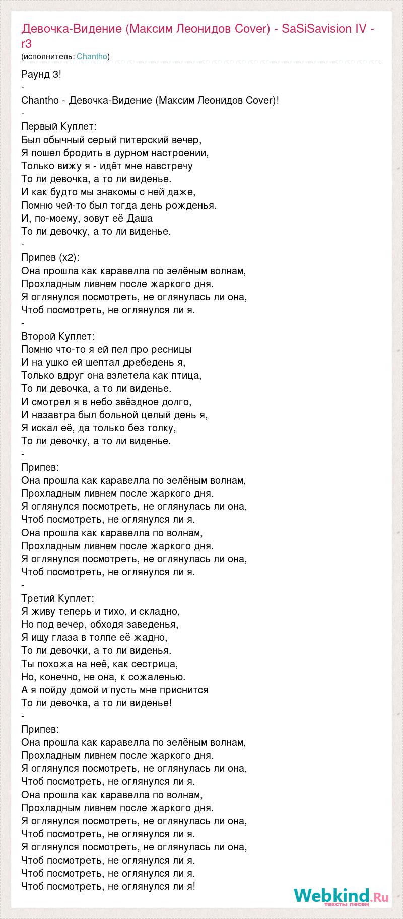 Раунд 3! - Chantho - Девочка-Видение (Максим Леонидов Cover)! - Первый Куплет: Был обычный серый питерский вечер, Я пошел бродить в дурном настроении, Только вижу я - идёт мне навстречу То ли девочка, а то ли виденье. И как будто мы знакомы с ней даже, Помню чей-то был тогда день рожденья. И, по-моему, зовут её Даша То ли девочку, а то ли виденье. - Припев (x2): Она прошла как каравелла по зелёным волнам, Прохладным ливнем после жаркого дня. Я оглянулся посмотреть, не оглянулась ли она, Чтоб посмотреть, не оглянулся ли я. - Второй Куплет: Помню что-то я ей пел про ресницы И на ушко ей шептал дребедень я, Только вдруг она взлетела как птица, То ли девочка, а то ли виденье. И смотрел я в небо звёздное долго, И назавтра был больной целый день я, Я искал её, да только без толку, То ли девочку, а то ли виденье. - Припев: Она прошла как каравелла по зелёным волнам, Прохладным ливнем после жаркого дня. Я оглянулся посмотреть, не оглянулась ли она, Чтоб посмотреть, не оглянулся ли я. Она прошла как каравелла по волнам, Прохладным ливнем после жаркого дня. Я оглянулся посмотреть, не оглянулась ли она, Чтоб посмотреть, не оглянулся ли я. - Третий Куплет: Я живу теперь и тихо, и складно, Но под вечер, обходя заведенья, Я ищу глаза в толпе её жадно, То ли девочки, а то ли виденья. Ты похожа на неё, как сестрица, Но, конечно, не она, к сожаленью. А я пойду домой и пусть мне приснится То ли девочка, а то ли виденье! - Припев: Она прошла как каравелла по зелёным волнам, Прохладным ливнем после жаркого дня. Я оглянулся посмотреть, не оглянулась ли она, Чтоб посмотреть, не оглянулся ли я. Она прошла как каравелла по волнам, Прохладным ливнем после жаркого дня. Я оглянулся посмотреть, не оглянулась ли она, Чтоб посмотреть, не оглянулся ли я. Я оглянулся посмотреть, не оглянулась ли она, Чтоб посмотреть, не оглянулся ли я. Чтоб посмотреть, не оглянулся ли я. Чтоб посмотреть, не оглянулся ли я!