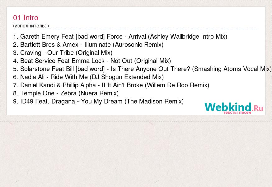 1. Gareth Emery Feat [bad word] Force - Arrival (Ashley Wallbridge Intro Mix) 2. Bartlett Bros & Amex - Illuminate (Aurosonic Remix) 3. Craving - Our Tribe (Original Mix) 4. Beat Service Feat Emma Lock - Not Out (Original Mix) 5. Solarstone Feat Bill [bad word] - Is There Anyone Out There? (Smashing Atoms Vocal Mix) 6. Nadia Ali - Ride With Me (DJ Shogun Extended Mix) 7. Daniel Kandi & Phillip Alpha - If It Ain't Broke (Willem De Roo Remix) 8. Temple One - Zebra (Nuera Remix) 9. ID49 Feat. Dragana - You My Dream (The Madison Remix)
