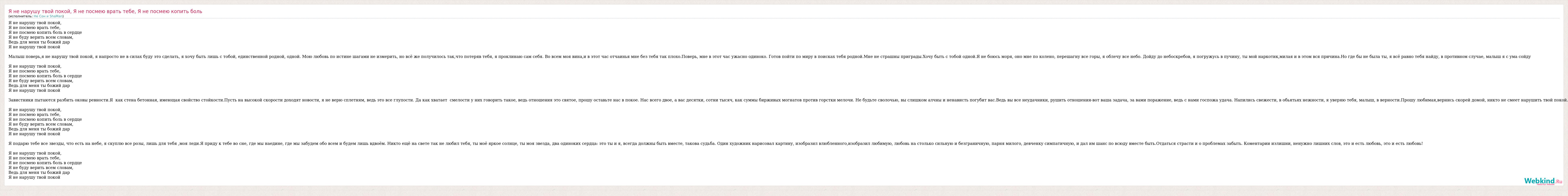 Я не нарушу твой покой, Я не посмею врать тебе, Я не посмею копить боль в сердце Я не буду верить всем словам, Ведь для меня ты божий дар Я не нарушу твой покой Малыш поверь,я не нарушу твой покой, я напросто не в силах буду это сделать, я хочу быть лишь с тобой, единственной родной, одной. Мою любовь по истине шагами не измерить, но всё же получилось так,что потеряв тебя, я проклинаю сам себя. Во всем моя вина,и в этот час отчаинья мне без тебя так плохо.Поверь, мне в этот час ужасно одиноко. Готов пойти по миру в поисках тебя родной.Мне не страшны приграды.Хочу быть с тобой одной.Я не боюсь моря, оно мне по колено, перешагну все горы, я облечу все небо. Дойду до небоскребов, я погружусь в пучину, ты мой наркотик,милая и в этом вся причина.Но где бы не была ты, я всё равно тебя найду, в противном случае, малыш я с ума сойду Я не нарушу твой покой, Я не посмею врать тебе, Я не посмею копить боль в сердце Я не буду верить всем словам, Ведь для меня ты божий дар Я не нарушу твой покой Завистники пытаются разбить оковы ревности.Я как стена бетонная, имеющая свойство стойкости.Пусть на высокой скорости доходят новости, я не верю сплетням, ведь это все глупости. Да как хватает смелости у них говорить такое, ведь отношения это святое, прошу оставьте нас в покое. Нас всего двое, а вас десятки, сотни тысяч, как суммы бирживых могнатов против горстки мелочи. Не будьте сволочью, вы слишком алчны и ненависть погубит вас.Ведь вы все неудачники, рушить отношения-вот ваша задача, за вами поражение, ведь с нами госпожа удача. Напились свежести, в обьятьях нежности, я уверяю тебя, малыш, в верности.Прошу любимая,вернись скорей домой, никто не смеет нарушить твой покой. Я не нарушу твой покой, Я не посмею врать тебе, Я не посмею копить боль в сердце Я не буду верить всем словам, Ведь для меня ты божий дар Я не нарушу твой покой Я подарю тебе все звезды, что есть на небе, я скуплю все розы, лишь для тебя ,моя леди.Я приду к тебе во сне, где мы наедине, где мы забудем обо всем и будем лишь вдвоём. Никто ещё на свете так не любил тебя, ты моё яркое солнце, ты моя звезда, два одиноких сердца: это ты и я, всегда должны быть вместе, такова судьба. Один художник нарисовал картину, изобразил влюбленного,изобразил любимую, любовь на столько сильную и безграничную, парня милого, девченку симпатичную, и дал им шанс по всюду вместе быть.Отдаться страсти и о проблемах забыть. Коментарии излишни, ненужно лишних слов, это и есть любовь, это и есть любовь! Я не нарушу твой покой, Я не посмею врать тебе, Я не посмею копить боль в сердце Я не буду верить всем словам, Ведь для меня ты божий дар Я не нарушу твой покой