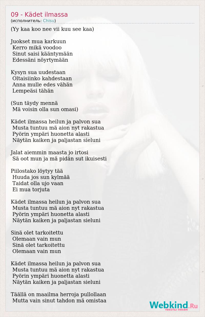 (Yy kaa koo nee vii kuu see kaa) Juokset mua karkuun Kerro mikä voodoo Sinut saisi kääntymään Edessäni nöyrtymään Kysyn sua uudestaan Oltaisiinko kahdestaan Anna mulle edes vähän Lempeäsi tähän (Sun täydy mennä Mä voisin olla sun omasi) Kädet ilmassa heilun ja palvon sua Musta tuntuu mä aion nyt rakastua Pyörin ympäri huonetta alasti Näytän kaiken ja paljastan sieluni Jalat aiemmin maasta jo irtosi Sä oot mun ja mä pidän sut ikuisesti Piilostako löytyy tää Huuda jos sun kylmää Taidat olla ujo vaan Ei mua torjuta Kädet ilmassa heilun ja palvon sua Musta tuntuu mä aion nyt rakastua Pyörin ympäri huonetta alasti Näytän kaiken ja paljastan sieluni Sinä olet tarkoitettu Olemaan vain mun Sinä olet tarkoitettu Olemaan vain mun Kädet ilmassa heilun ja palvon sua Musta tuntuu mä aion nyt rakastua Pyörin ympäri huonetta alasti Näytän kaiken ja paljastan sieluni Täällä on maailma herroja pullollaan Mutta vain sinut tahdon mä omistaa