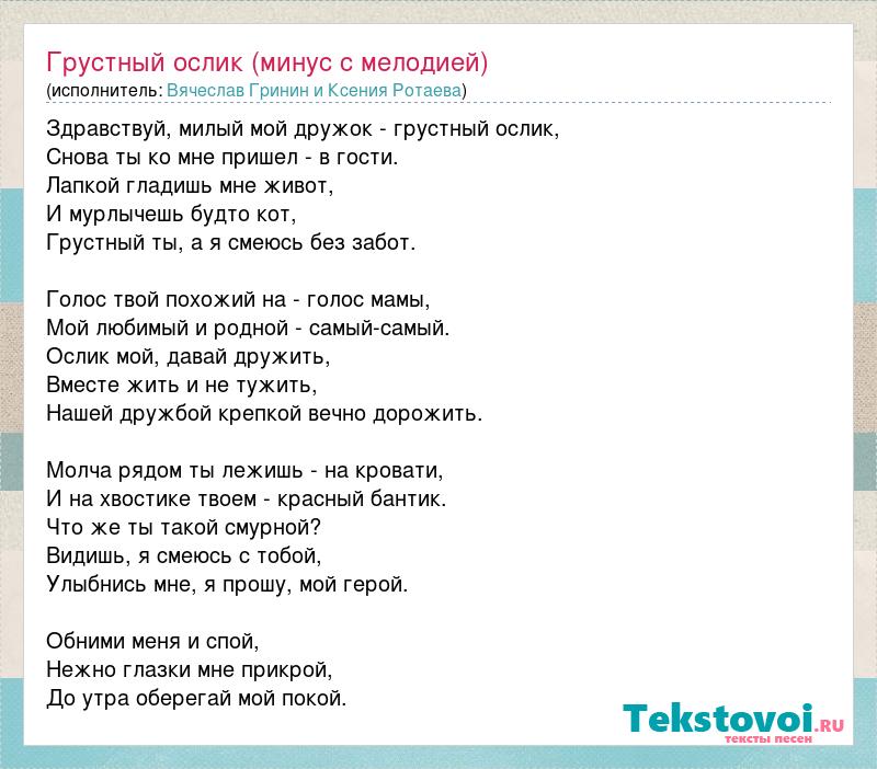 Здравствуй, милый мой дружок - грустный ослик, Снова ты ко мне пришел - в гости. Лапкой гладишь мне живот, И мурлычешь будто кот, Грустный ты, а я смеюсь без забот. Голос твой похожий на - голос мамы, Мой любимый и родной - самый-самый. Ослик мой, давай дружить, Вместе жить и не тужить, Нашей дружбой крепкой вечно дорожить. Молча рядом ты лежишь - на кровати, И на хвостике твоем - красный бантик. Что же ты такой смурной? Видишь, я смеюсь с тобой, Улыбнись мне, я прошу, мой герой. Обними меня и спой, Нежно глазки мне прикрой, До утра оберегай мой покой.