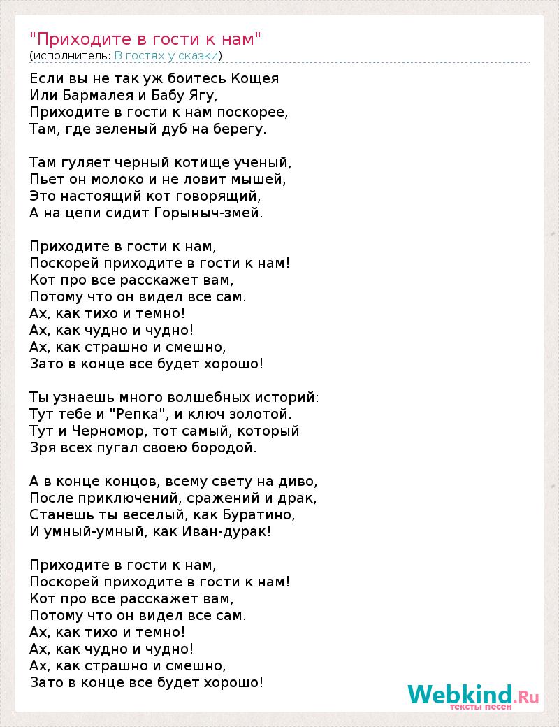 Если вы не так уж боитесь Кощея Или Бармалея и Бабу Ягу, Приходите в гости к нам поскорее, Там, где зеленый дуб на берегу. Там гуляет черный котище ученый, Пьет он молоко и не ловит мышей, Это настоящий кот говорящий, А на цепи сидит Горыныч-змей. Приходите в гости к нам, Поскорей приходите в гости к нам! Кот про все расскажет вам, Потому что он видел все сам. Ах, как тихо и темно! Ах, как чудно и чудно! Ах, как страшно и смешно, Зато в конце все будет хорошо! Ты узнаешь много волшебных историй: Тут тебе и "Репка", и ключ золотой. Тут и Черномор, тот самый, который Зря всех пугал своею бородой. А в конце концов, всему свету на диво, После приключений, сражений и драк, Станешь ты веселый, как Буратино, И умный-умный, как Иван-дурак! Приходите в гости к нам, Поскорей приходите в гости к нам! Кот про все расскажет вам, Потому что он видел все сам. Ах, как тихо и темно! Ах, как чудно и чудно! Ах, как страшно и смешно, Зато в конце все будет хорошо!