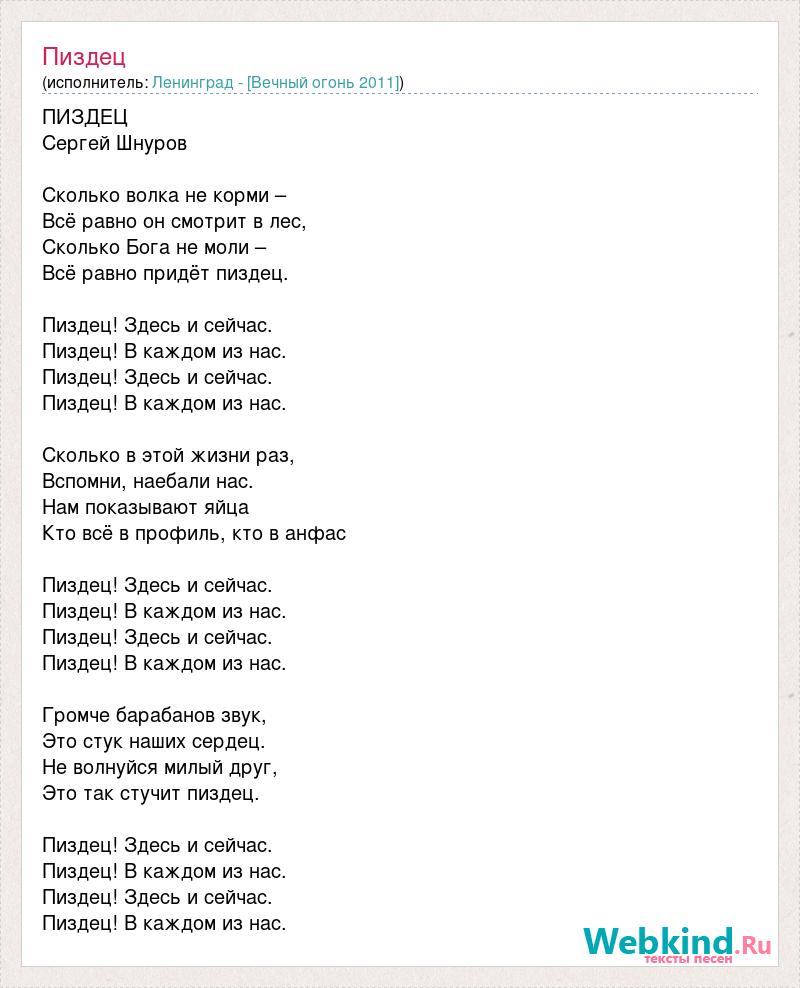 ПИЗДЕЦ Сергей Шнуров Сколько волка не корми – Всё равно он смотрит в лес, Сколько Бога не моли – Всё равно придёт пиздец. Пиздец! Здесь и сейчас. Пиздец! В каждом из нас. Пиздец! Здесь и сейчас. Пиздец! В каждом из нас. Сколько в этой жизни раз, Вспомни, наебали нас. Нам показывают яйца Кто всё в профиль, кто в анфас Пиздец! Здесь и сейчас. Пиздец! В каждом из нас. Пиздец! Здесь и сейчас. Пиздец! В каждом из нас. Громче барабанов звук, Это стук наших сердец. Не волнуйся милый друг, Это так стучит пиздец. Пиздец! Здесь и сейчас. Пиздец! В каждом из нас. Пиздец! Здесь и сейчас. Пиздец! В каждом из нас.