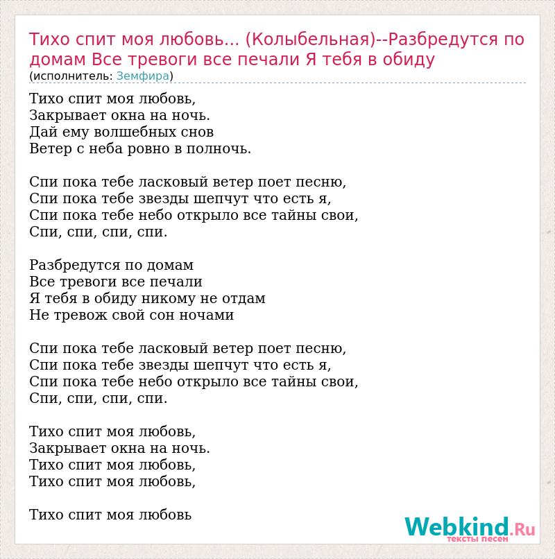 Тихо спит моя любовь, Закрывает окна на ночь. Дай ему волшебных снов Ветер с неба ровно в полночь. Спи пока тебе ласковый ветер поет песню, Спи пока тебе звезды шепчут что есть я, Спи пока тебе небо открыло все тайны свои, Спи, спи, спи, спи. Разбредутся по домам Все тревоги все печали Я тебя в обиду никому не отдам Не тревож свой сон ночами Спи пока тебе ласковый ветер поет песню, Спи пока тебе звезды шепчут что есть я, Спи пока тебе небо открыло все тайны свои, Спи, спи, спи, спи. Тихо спит моя любовь, Закрывает окна на ночь. Тихо спит моя любовь, Тихо спит моя любовь, Тихо спит моя любовь