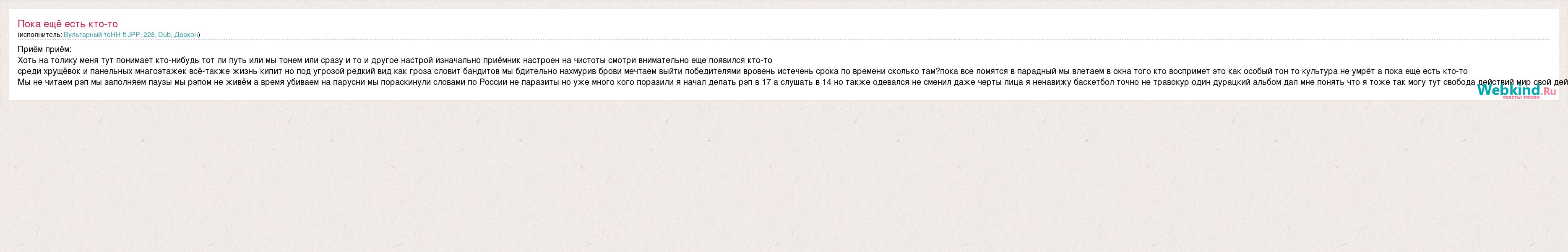Приём приём: Хоть на толику меня тут понимает кто-нибудь тот ли путь или мы тонем или сразу и то и другое настрой изначально приёмник настроен на чистоты смотри внимательно еще появился кто-то среди хрущёвок и панельных мнагоэтажек всё-также жизнь кипит но под угрозой редкий вид как гроза словит бандитов мы бдительно нахмурив брови мечтаем выйти победителями вровень истечень срока по времени сколько там?пока все ломятся в парадный мы влетаем в окна того кто воспримет это как особый тон то культура не умрёт а пока еще есть кто-то Мы не читаем рэп мы заполняем паузы мы рэпом не живём а время убиваем на парусни мы пораскинули словами по России не паразиты но уже много кого поразили я начал делать рэп в 17 а слушать в 14 но также одевался не сменил даже черты лица я ненавижу баскетбол точно не травокур один дурацкий альбом дал мне понять что я тоже так могу тут свобода действий мир свой дей