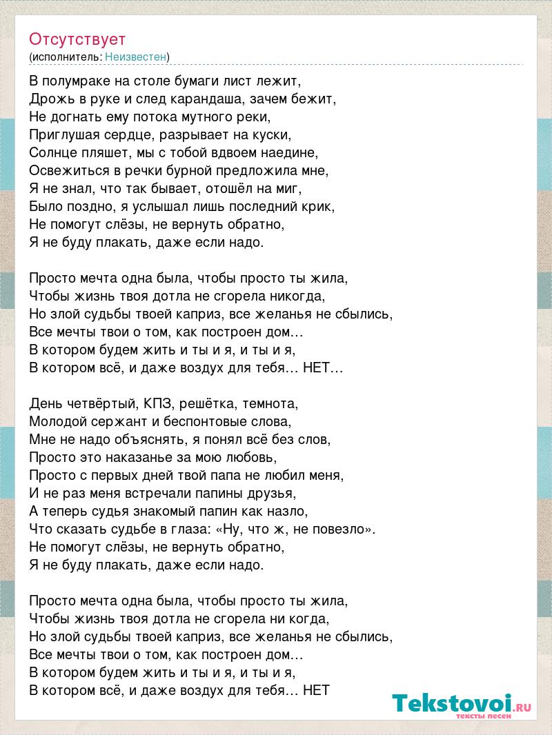 В полумраке на столе бумаги лист лежит, Дрожь в руке и след карандаша, зачем бежит, Не догнать ему потока мутного реки, Приглушая сердце, разрывает на куски, Солнце пляшет, мы с тобой вдвоем наедине, Освежиться в речки бурной предложила мне, Я не знал, что так бывает, отошёл на миг, Было поздно, я услышал лишь последний крик, Не помогут слёзы, не вернуть обратно, Я не буду плакать, даже если надо. Просто мечта одна была, чтобы просто ты жила, Чтобы жизнь твоя дотла не сгорела никогда, Но злой судьбы твоей каприз, все желанья не сбылись, Все мечты твои о том, как построен дом… В котором будем жить и ты и я, и ты и я, В котором всё, и даже воздух для тебя… НЕТ… День четвёртый, КПЗ, решётка, темнота, Молодой сержант и беспонтовые слова, Мне не надо объяснять, я понял всё без слов, Просто это наказанье за мою любовь, Просто с первых дней твой папа не любил меня, И не раз меня встречали папины друзья, А теперь судья знакомый папин как назло, Что сказать судьбе в глаза: «Ну, что ж, не повезло». Не помогут слёзы, не вернуть обратно, Я не буду плакать, даже если надо. Просто мечта одна была, чтобы просто ты жила, Чтобы жизнь твоя дотла не сгорела ни когда, Но злой судьбы твоей каприз, все желанья не сбылись, Все мечты твои о том, как построен дом… В котором будем жить и ты и я, и ты и я, В котором всё, и даже воздух для тебя… НЕТ