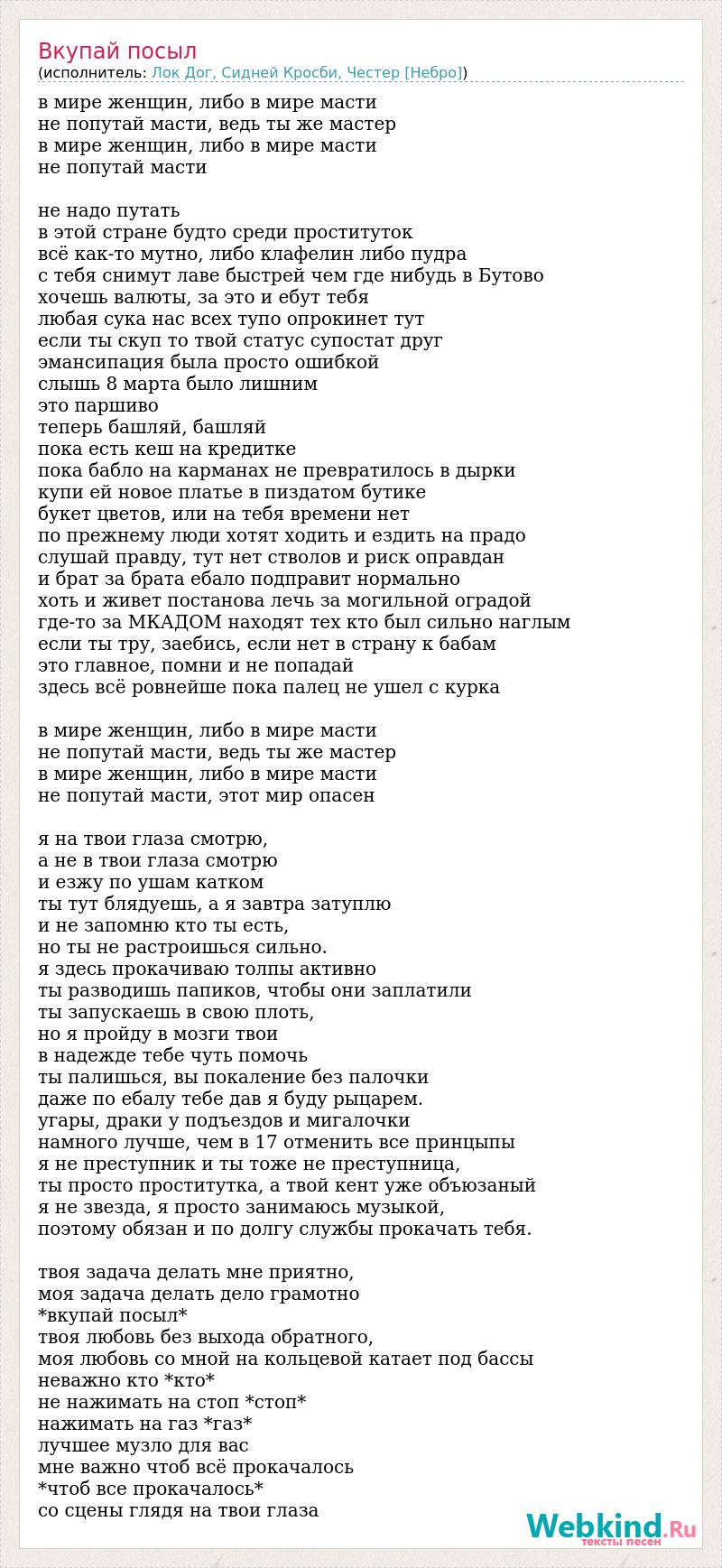 в мире женщин, либо в мире масти не попутай масти, ведь ты же мастер в мире женщин, либо в мире масти не попутай масти не надо путать в этой стране будто среди проституток всё как-то мутно, либо клафелин либо пудра с тебя снимут лаве быстрей чем где нибудь в Бутово хочешь валюты, за это и ебут тебя любая сука нас всех тупо опрокинет тут если ты скуп то твой статус супостат друг эмансипация была просто ошибкой слышь 8 марта было лишним это паршиво теперь башляй, башляй пока есть кеш на кредитке пока бабло на карманах не превратилось в дырки купи ей новое платье в пиздатом бутике букет цветов, или на тебя времени нет по прежнему люди хотят ходить и ездить на прадо слушай правду, тут нет стволов и риск оправдан и брат за брата ебало подправит нормально хоть и живет постанова лечь за могильной оградой где-то за МКАДОМ находят тех кто был сильно наглым если ты тру, заебись, если нет в страну к бабам это главное, помни и не попадай здесь всё ровнейше пока палец не ушел с курка в мире женщин, либо в мире масти не попутай масти, ведь ты же мастер в мире женщин, либо в мире масти не попутай масти, этот мир опасен я на твои глаза смотрю, а не в твои глаза смотрю и езжу по ушам катком ты тут блядуешь, а я завтра затуплю и не запомню кто ты есть, но ты не растроишься сильно. я здесь прокачиваю толпы активно ты разводишь папиков, чтобы они заплатили ты запускаешь в свою плоть, но я пройду в мозги твои в надежде тебе чуть помочь ты палишься, вы покаление без палочки даже по ебалу тебе дав я буду рыцарем. угары, драки у подъездов и мигалочки намного лучше, чем в 17 отменить все принцыпы я не преступник и ты тоже не преступница, ты просто проститутка, а твой кент уже объюзаный я не звезда, я просто занимаюсь музыкой, поэтому обязан и по долгу службы прокачать тебя. твоя задача делать мне приятно, моя задача делать дело грамотно *вкупай посыл* твоя любовь без выхода обратного, моя любовь со мной на кольцевой катает под бассы неважно кто *кто* не нажимать на стоп *стоп* нажимать на газ *газ* лучшее музло для вас мне важно чтоб всё прокачалось *чтоб все прокачалось* со сцены глядя на твои глаза