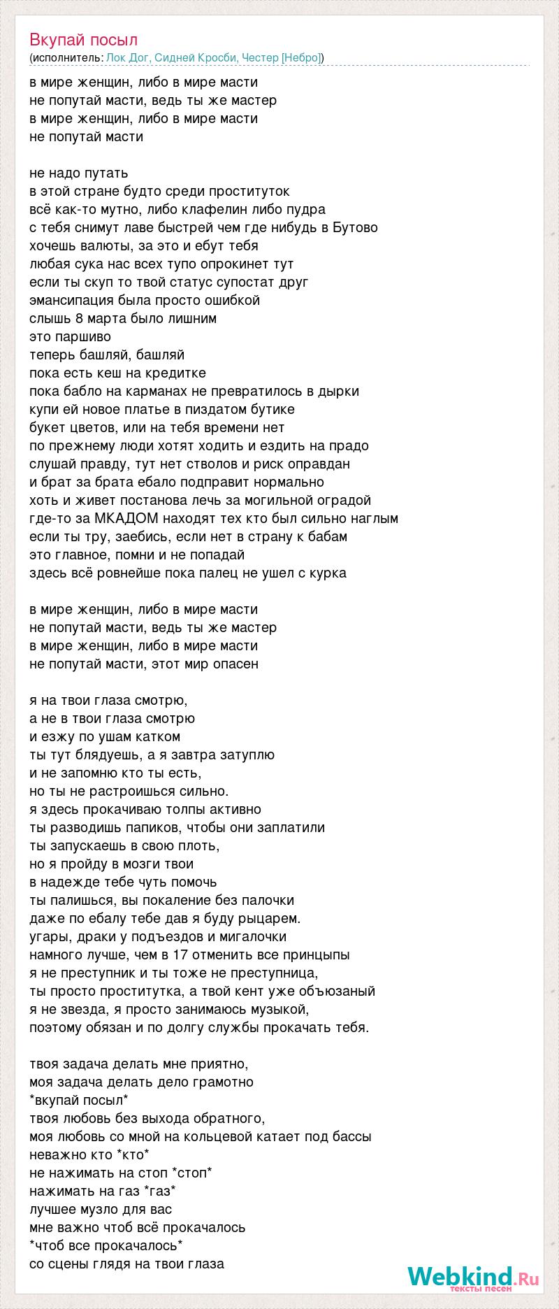 в мире женщин, либо в мире масти не попутай масти, ведь ты же мастер в мире женщин, либо в мире масти не попутай масти не надо путать в этой стране будто среди проституток всё как-то мутно, либо клафелин либо пудра с тебя снимут лаве быстрей чем где нибудь в Бутово хочешь валюты, за это и ебут тебя любая сука нас всех тупо опрокинет тут если ты скуп то твой статус супостат друг эмансипация была просто ошибкой слышь 8 марта было лишним это паршиво теперь башляй, башляй пока есть кеш на кредитке пока бабло на карманах не превратилось в дырки купи ей новое платье в пиздатом бутике букет цветов, или на тебя времени нет по прежнему люди хотят ходить и ездить на прадо слушай правду, тут нет стволов и риск оправдан и брат за брата ебало подправит нормально хоть и живет постанова лечь за могильной оградой где-то за МКАДОМ находят тех кто был сильно наглым если ты тру, заебись, если нет в страну к бабам это главное, помни и не попадай здесь всё ровнейше пока палец не ушел с курка в мире женщин, либо в мире масти не попутай масти, ведь ты же мастер в мире женщин, либо в мире масти не попутай масти, этот мир опасен я на твои глаза смотрю, а не в твои глаза смотрю и езжу по ушам катком ты тут блядуешь, а я завтра затуплю и не запомню кто ты есть, но ты не растроишься сильно. я здесь прокачиваю толпы активно ты разводишь папиков, чтобы они заплатили ты запускаешь в свою плоть, но я пройду в мозги твои в надежде тебе чуть помочь ты палишься, вы покаление без палочки даже по ебалу тебе дав я буду рыцарем. угары, драки у подъездов и мигалочки намного лучше, чем в 17 отменить все принцыпы я не преступник и ты тоже не преступница, ты просто проститутка, а твой кент уже объюзаный я не звезда, я просто занимаюсь музыкой, поэтому обязан и по долгу службы прокачать тебя. твоя задача делать мне приятно, моя задача делать дело грамотно *вкупай посыл* твоя любовь без выхода обратного, моя любовь со мной на кольцевой катает под бассы неважно кто *кто* не нажимать на стоп *стоп* нажимать на газ *газ* лучшее музло для вас мне важно чтоб всё прокачалось *чтоб все прокачалось* со сцены глядя на твои глаза