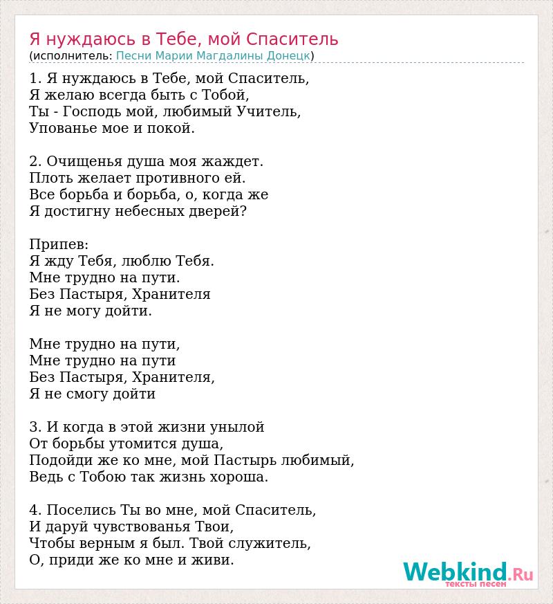 1. Я нуждаюсь в Тебе, мой Спаситель, Я желаю всегда быть с Тобой, Ты - Господь мой, любимый Учитель, Упованье мое и покой. 2. Очищенья душа моя жаждет. Плоть желает противного ей. Все борьба и борьба, о, когда же Я достигну небесных дверей? Припев: Я жду Тебя, люблю Тебя. Мне трудно на пути. Без Пастыря, Хранителя Я не могу дойти. Мне трудно на пути, Мне трудно на пути Без Пастыря, Хранителя, Я не смогу дойти 3. И когда в этой жизни унылой От борьбы утомится душа, Подойди же ко мне, мой Пастырь любимый, Ведь с Тобою так жизнь хороша. 4. Поселись Ты во мне, мой Спаситель, И даруй чувствованья Твои, Чтобы верным я был. Твой служитель, О, приди же ко мне и живи.