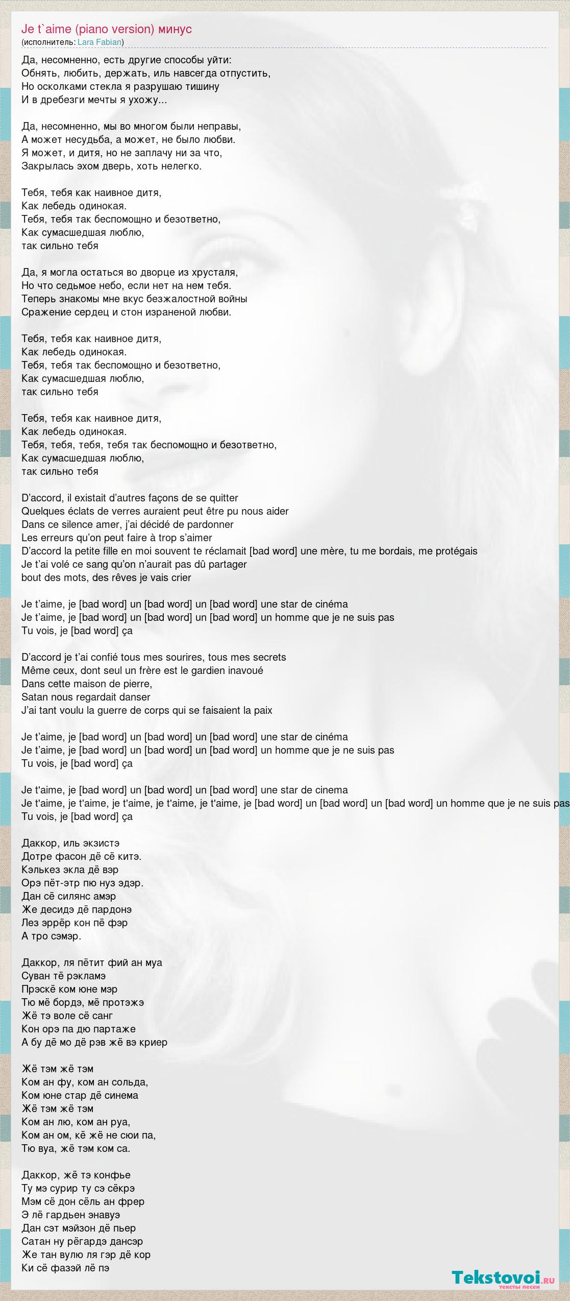 Да, несомненно, есть другие способы уйти: Обнять, любить, держать, иль навсегда отпустить, Но осколками стекла я разрушаю тишину И в дребезги мечты я ухожу... Да, несомненно, мы во многом были неправы, А может несудьба, а может, не было любви. Я может, и дитя, но не заплачу ни за что, Закрылась эхом дверь, хоть нелегко. Тебя, тебя как наивное дитя, Как лебедь одинокая. Тебя, тебя так беспомощно и безответно, Как сумасшедшая люблю, так сильно тебя Да, я могла остаться во дворце из хрусталя, Но что седьмое небо, если нет на нем тебя. Теперь знакомы мне вкус безжалостной войны Сражение сердец и стон израненой любви. Тебя, тебя как наивное дитя, Как лебедь одинокая. Тебя, тебя так беспомощно и безответно, Как сумасшедшая люблю, так сильно тебя Тебя, тебя как наивное дитя, Как лебедь одинокая. Тебя, тебя, тебя, тебя так беспомощно и безответно, Как сумасшедшая люблю, так сильно тебя D’accord, il existait d’autres façons de se quitter Quelques éclats de verres auraient peut être pu nous aider Dans ce silence amer, j’ai décidé de pardonner Les erreurs qu’on peut faire à trop s’aimer D’accord la petite fille en moi souvent te réclamait Presque comme une mère, tu me bordais, me protégais Je t’ai volé ce sang qu’on n’aurait pas dû partager bout des mots, des rêves je vais crier Je t’aime, je t’aime Comme un fou comme un soldat Comme une star de cinéma Je t’aime, je t’aime Comme un loup comme un roi Comme un homme que je ne suis pas Tu vois, je t’aime comme ça D’accord je t’ai confié tous mes sourires, tous mes secrets Même ceux, dont seul un frère est le gardien inavoué Dans cette maison de pierre, Satan nous regardait danser J’ai tant voulu la guerre de corps qui se faisaient la paix Je t’aime, je t’aime Comme un fou comme un soldat Comme une star de cinéma Je t’aime, je t’aime Comme un loup comme un roi Comme un homme que je ne suis pas Tu vois, je t’aime comme ça Je t'aime, je t'aime Comme un fou comme un soldat Comme une star de cinema Je t'aime, je t'aime, je t'aime, je t'aime, je t'aime, je t'aime Comme un loup comme un roi Comme un homme que je ne suis pas Tu vois, je t’aime comme ça Даккор, иль экзистэ Дотре фасон дё сё китэ. Кэлькез экла дё вэр Орэ пёт-этр пю нуз эдэр. Дан сё силянс амэр Же десидэ дё пардонэ Лез эррёр кон пё фэр А тро сэмэр. Даккор, ля пётит фий ан муа Суван тё рэкламэ Прэскё ком юне мэр Тю мё бордэ, мё протэжэ Жё тэ воле сё санг Кон орэ па дю партаже А бу дё мо дё рэв жё вэ криер Жё тэм жё тэм Ком ан фу, ком ан сольда, Ком юне стар дё синема Жё тэм жё тэм Ком ан лю, ком ан руа, Ком ан ом, кё жё не сюи па, Тю вуа, жё тэм ком са. Даккор, жё тэ конфье Ту мэ сурир ту сэ сёкрэ Мэм сё дон сёль ан фрер Э лё гардьен энавуэ Дан сэт мэйзон дё пьер Сатан ну рёгардэ дансэр Же тан вулю ля гэр дё кор Ки сё фазэй лё пэ