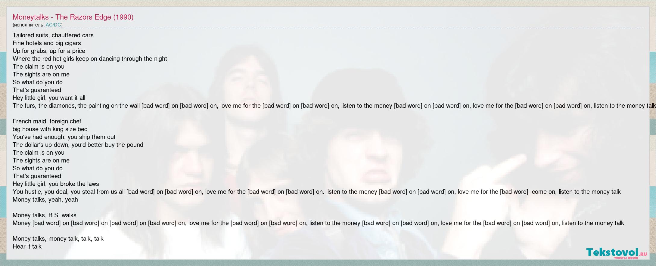 А как ты думаешь, о чем песня "Moneytalks - The Razors Edge (1990)" ?