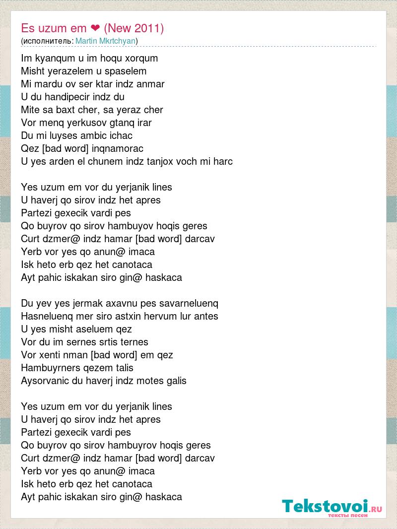 Im kyanqum u im hoqu xorqum Misht yerazelem u spaselem Mi mardu ov ser ktar indz anmar U du handipecir indz du Mite sa baxt cher, sa yeraz cher Vor menq yerkusov gtanq irar Du mi luyses ambic ichac Qez sirumem inqnamorac U yes arden el chunem indz tanjox voch mi harc Yes uzum em vor du yerjanik lines U haverj qo sirov indz het apres Partezi gexecik vardi pes Qo buyrov qo sirov hambuyov hoqis geres Curt dzmer@ indz hamar garun darcav Yerb vor yes qo anun@ imaca Isk heto erb qez het canotaca Ayt pahic iskakan siro gin@ haskaca Du yev yes jermak axavnu pes savarneluenq Hasneluenq mer siro astxin hervum lur antes U yes misht aseluem qez Vor du im sernes srtis ternes Vor xenti nman sirum em qez Hambuyrners qezem talis Aysorvanic du haverj indz motes galis Yes uzum em vor du yerjanik lines U haverj qo sirov indz het apres Partezi gexecik vardi pes Qo buyrov qo sirov hambuyrov hoqis geres Curt dzmer@ indz hamar garun darcav Yerb vor yes qo anun@ imaca Isk heto erb qez het canotaca Ayt pahic iskakan siro gin@ haskaca