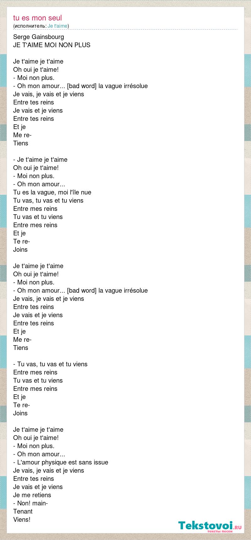 Serge Gainsbourg JE T'AIME MOI NON PLUS Je t'aime je t'aime Oh oui je t'aime! - Moi non plus. - Oh mon amour... - Comme la vague irrésolue Je vais, je vais et je viens Entre tes reins Je vais et je viens Entre tes reins Et je Me re- Tiens - Je t'aime je t'aime Oh oui je t'aime! - Moi non plus. - Oh mon amour... Tu es la vague, moi l'île nue Tu vas, tu vas et tu viens Entre mes reins Tu vas et tu viens Entre mes reins Et je Te re- Joins Je t'aime je t'aime Oh oui je t'aime! - Moi non plus. - Oh mon amour... - Comme la vague irrésolue Je vais, je vais et je viens Entre tes reins Je vais et je viens Entre tes reins Et je Me re- Tiens - Tu vas, tu vas et tu viens Entre mes reins Tu vas et tu viens Entre mes reins Et je Te re- Joins Je t'aime je t'aime Oh oui je t'aime! - Moi non plus. - Oh mon amour... - L'amour physique est sans issue Je vais, je vais et je viens Entre tes reins Je vais et je viens Je me retiens - Non! main- Tenant Viens!