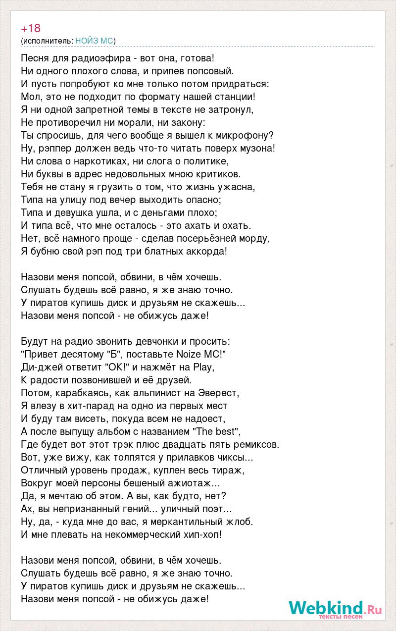 Песня для радиоэфира - вот она, готова! Ни одного плохого слова, и припев попсовый. И пусть попробуют ко мне только потом придраться: Мол, это не подходит по формату нашей станции! Я ни одной запретной темы в тексте не затронул, Не противоречил ни морали, ни закону: Ты спросишь, для чего вообще я вышел к микрофону? Ну, рэппер должен ведь что-то читать поверх музона! Ни слова о наркотиках, ни слога о политике, Ни буквы в адрес недовольных мною критиков. Тебя не стану я грузить о том, что жизнь ужасна, Типа на улицу под вечер выходить опасно; Типа и девушка ушла, и с деньгами плохо; И типа всё, что мне осталось - это ахать и охать. Нет, всё намного проще - сделав посерьёзней морду, Я бубню свой рэп под три блатных аккорда! Назови меня попсой, обвини, в чём хочешь. Слушать будешь всё равно, я же знаю точно. У пиратов купишь диск и друзьям не скажешь... Назови меня попсой - не обижусь даже! Будут на радио звонить девчонки и просить: "Привет десятому "Б", поставьте Noize MC!" Ди-джей ответит "ОК!" и нажмёт на Play, К радости позвонившей и её друзей. Потом, карабкаясь, как альпинист на Эверест, Я влезу в хит-парад на одно из первых мест И буду там висеть, покуда всем не надоест, А после выпущу альбом с названием "The best", Где будет вот этот трэк плюс двадцать пять ремиксов. Вот, уже вижу, как толпятся у прилавков чиксы... Отличный уровень продаж, куплен весь тираж, Вокруг моей персоны бешеный ажиотаж... Да, я мечтаю об этом. А вы, как будто, нет? Ах, вы непризнанный гений... уличный поэт... Ну, да, - куда мне до вас, я меркантильный жлоб. И мне плевать на некоммерческий хип-хоп! Назови меня попсой, обвини, в чём хочешь. Слушать будешь всё равно, я же знаю точно. У пиратов купишь диск и друзьям не скажешь... Назови меня попсой - не обижусь даже!