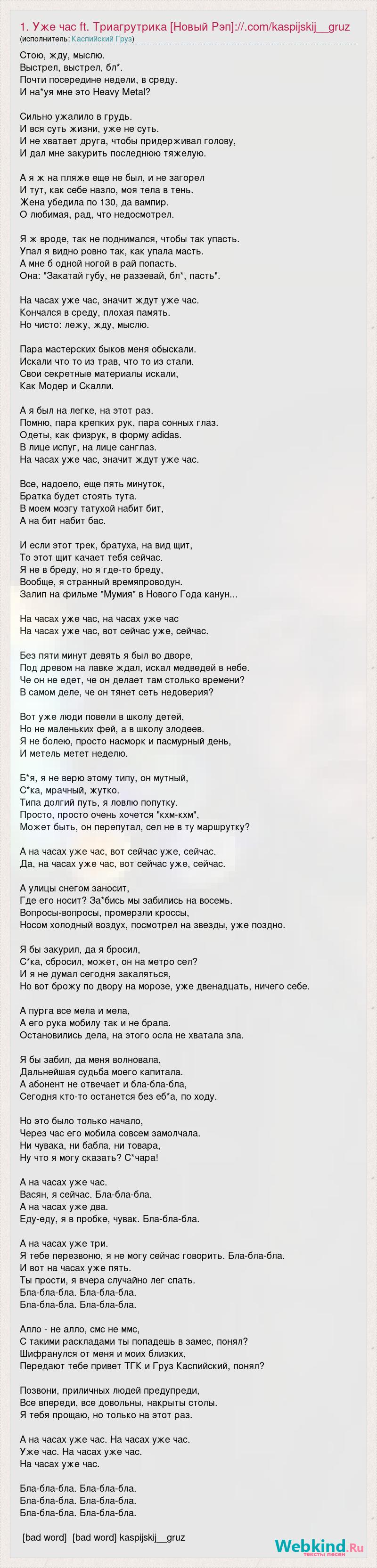 Стою, жду, мыслю. Выстрел, выстрел, бл*. Почти посередине недели, в среду. И на*уя мне это Heavy Metal? Сильно ужалило в грудь. И вся суть жизни, уже не суть. И не хватает друга, чтобы придерживал голову, И дал мне закурить последнюю тяжелую. А я ж на пляже еще не был, и не загорел И тут, как себе назло, моя тела в тень. Жена убедила по 130, да вампир. О любимая, рад, что недосмотрел. Я ж вроде, так не поднимался, чтобы так упасть. Упал я видно ровно так, как упала масть. А мне б одной ногой в рай попасть. Она: "Закатай губу, не раззевай, бл*, пасть". На часах уже час, значит ждут уже час. Кончался в среду, плохая память. Но чисто: лежу, жду, мыслю. Пара мастерских быков меня обыскали. Искали что то из трав, что то из стали. Свои секретные материалы искали, Как Модер и Скалли. А я был на легке, на этот раз. Помню, пара крепких рук, пара сонных глаз. Одеты, как физрук, в форму adidas. В лице испуг, на лице санглаз. На часах уже час, значит ждут уже час. Все, надоело, еще пять минуток, Братка будет стоять тута. В моем мозгу татухой набит бит, А на бит набит бас. И если этот трек, братуха, на вид щит, То этот щит качает тебя сейчас. Я не в бреду, но я где-то бреду, Вообще, я странный времяпроводун. Залип на фильме "Мумия" в Нового Года канун... На часах уже час, на часах уже час На часах уже час, вот сейчас уже, сейчас. Без пяти минут девять я был во дворе, Под древом на лавке ждал, искал медведей в небе. Че он не едет, че он делает там столько времени? В самом деле, че он тянет сеть недоверия? Вот уже люди повели в школу детей, Но не маленьких фей, а в школу злодеев. Я не болею, просто насморк и пасмурный день, И метель метет неделю. Б*я, я не верю этому типу, он мутный, С*ка, мрачный, жутко. Типа долгий путь, я ловлю попутку. Просто, просто очень хочется "кхм-кхм", Может быть, он перепутал, сел не в ту маршрутку? А на часах уже час, вот сейчас уже, сейчас. Да, на часах уже час, вот сейчас уже, сейчас. А улицы снегом заносит, Где его носит? За*бись мы забились на восемь. Вопросы-вопросы, промерзли кроссы, Носом холодный воздух, посмотрел на звезды, уже поздно. Я бы закурил, да я бросил, С*ка, сбросил, может, он на метро сел? И я не думал сегодня закаляться, Но вот брожу по двору на морозе, уже двенадцать, ничего себе. А пурга все мела и мела, А его рука мобилу так и не брала. Остановились дела, на этого осла не хватала зла. Я бы забил, да меня волновала, Дальнейшая судьба моего капитала. А абонент не отвечает и бла-бла-бла, Сегодня кто-то останется без еб*а, по ходу. Но это было только начало, Через час его мобила совсем замолчала. Ни чувака, ни бабла, ни товара, Ну что я могу сказать? С*чара! А на часах уже час. Васян, я сейчас. Бла-бла-бла. А на часах уже два. Еду-еду, я в пробке, чувак. Бла-бла-бла. А на часах уже три. Я тебе перезвоню, я не могу сейчас говорить. Бла-бла-бла. И вот на часах уже пять. Ты прости, я вчера случайно лег спать. Бла-бла-бла. Бла-бла-бла. Бла-бла-бла. Бла-бла-бла. Алло - не алло, смс не ммс, С такими раскладами ты попадешь в замес, понял? Шифранулся от меня и моих близких, Передают тебе привет ТГК и Груз Каспийский, понял? Позвони, приличных людей предупреди, Все впереди, все довольны, накрыты столы. Я тебя прощаю, но только на этот раз. А на часах уже час. На часах уже час. Уже час. На часах уже час. На часах уже час. Бла-бла-бла. Бла-бла-бла. Бла-бла-бла. Бла-бла-бла. Бла-бла-бла. Бла-бла-бла. [bad word] [bad word] kaspijskij__gruz