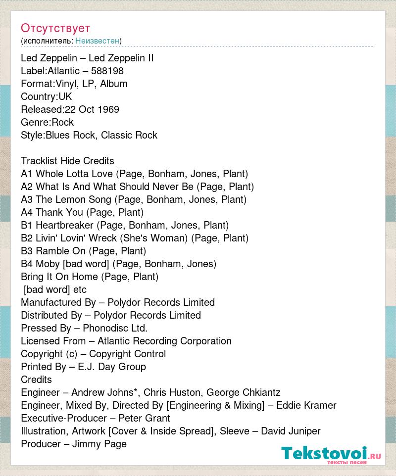 Led Zeppelin – Led Zeppelin II Label:Atlantic – 588198 Format:Vinyl, LP, Album Country:UK Released:22 Oct 1969 Genre:Rock Style:Blues Rock, Classic Rock Tracklist Hide Credits A1 Whole Lotta Love (Page, Bonham, Jones, Plant) A2 What Is And What Should Never Be (Page, Plant) A3 The Lemon Song (Page, Bonham, Jones, Plant) A4 Thank You (Page, Plant) B1 Heartbreaker (Page, Bonham, Jones, Plant) B2 Livin' Lovin' Wreck (She's Woman) (Page, Plant) B3 Ramble On (Page, Plant) B4 Moby Dick (Page, Bonham, Jones) Bring It On Home (Page, Plant) Companies etc Manufactured By – Polydor Records Limited Distributed By – Polydor Records Limited Pressed By – Phonodisc Ltd. Licensed From – Atlantic Recording Corporation Copyright (c) – Copyright Control Printed By – E.J. Day Group Credits Engineer – Andrew Johns*, Chris Huston, George Chkiantz Engineer, Mixed By, Directed By [Engineering & Mixing] – Eddie Kramer Executive-Producer – Peter Grant Illustration, Artwork [Cover & Inside Spread], Sleeve – David Juniper Producer – Jimmy Page
