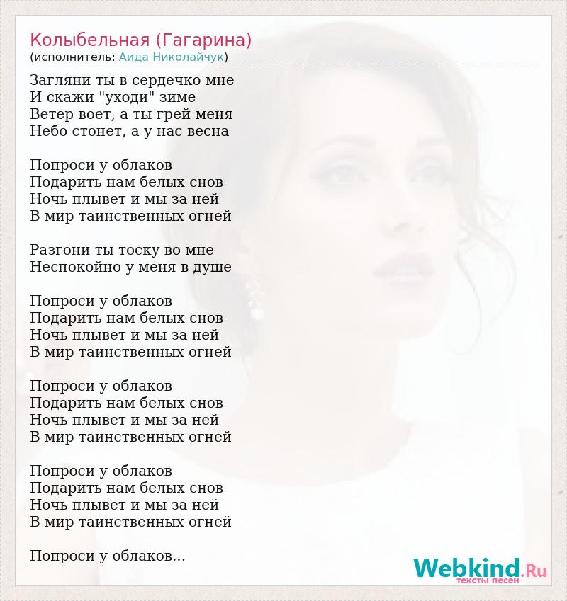 Загляни ты в сердечко мне И скажи "уходи" зиме Ветер воет, а ты грей меня Небо стонет, а у нас весна Попроси у облаков Подарить нам белых снов Ночь плывет и мы за ней В мир таинственных огней Разгони ты тоску во мне Неспокойно у меня в душе Попроси у облаков Подарить нам белых снов Ночь плывет и мы за ней В мир таинственных огней Попроси у облаков Подарить нам белых снов Ночь плывет и мы за ней В мир таинственных огней Попроси у облаков Подарить нам белых снов Ночь плывет и мы за ней В мир таинственных огней Попроси у облаков...