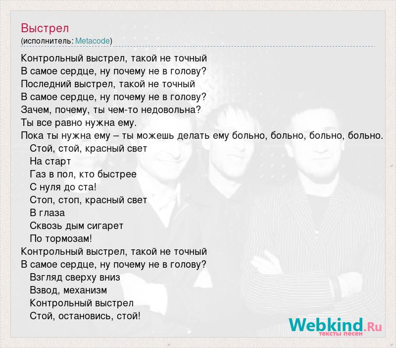 Контрольный выстрел, такой не точный В самое сердце, ну почему не в голову? Последний выстрел, такой не точный В самое сердце, ну почему не в голову? Зачем, почему, ты чем-то недовольна? Ты все равно нужна ему. Пока ты нужна ему – ты можешь делать ему больно, больно, больно, больно. Стой, стой, красный свет На старт Газ в пол, кто быстрее С нуля до ста! Стоп, стоп, красный свет В глаза Сквозь дым сигарет По тормозам! Контрольный выстрел, такой не точный В самое сердце, ну почему не в голову? Взгляд сверху вниз Взвод, механизм Контрольный выстрел Стой, остановись, стой!