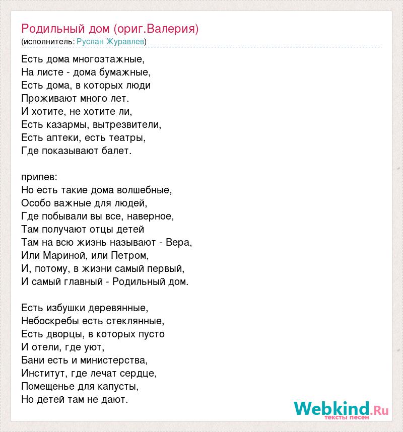 Есть дома многозтажные, Hа листе - дома бумажные, Есть дома, в которых люди Проживают много лет. И хотите, не хотите ли, Есть казармы, вытрезвители, Есть аптеки, есть театры, Где показывают балет. припев: Hо есть такие дома волшебные, Особо важные для людей, Где побывали вы все, наверное, Там получают отцы детей Там на всю жизнь называют - Вера, Или Мариной, или Петром, И, потому, в жизни самый первый, И самый главный - Родильный дом. Есть избушки деревянные, Hебоскребы есть стеклянные, Есть дворцы, в которых пусто И отели, где уют, Бани есть и министерства, Институт, где лечат сердце, Помещенье для капусты, Hо детей там не дают.