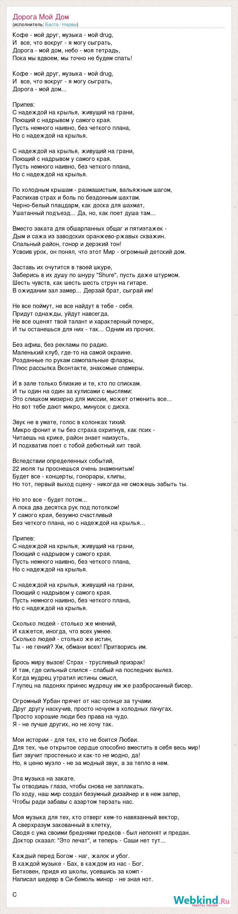 Кофе - мой друг, музыка - мой drug, И все, что вокруг - я могу сыграть, Дорога - мой дом, небо - моя тетрадь, Пока мы вдвоем, мы точно не будем спать! Кофе - мой друг, музыка - мой drug, И все, что вокруг - я могу сыграть, Дорога - мой дом... Припев: С надеждой на крылья, живущий на грани, Поющий с надрывом у самого края. Пусть немного наивно, без четкого плана, Но с надеждой на крылья. С надеждой на крылья, живущий на грани, Поющий с надрывом у самого края. Пусть немного наивно, без четкого плана, Но с надеждой на крылья. По холодным крышам - размашистым, вальяжным шагом, Распихав страх и боль по бездонным шахтам. Черно-белый плацдарм, как доска для шахмат, Ушатанный подъезд... Да, но, как поет душа там... Вместо заката для обшарпанных общаг и пятиэтажек - Дым и сажа из заводских оранжево-ржавых скважин. Спальный район, гонор и дерзкий тон! Усвоив урок, он понял, что этот Мир - огромный детский дом. Заставь их очутится в твоей шкуре, Заберись в их душу по шнуру "Shure", пусть даже штурмом. Шесть чувств, как шесть шесть струн на гитаре. В ожидании зал замер... Дерзай брат, сыграй им! Не все поймут, не все найдут в тебе - себя. Придут однажды, уйдут навсегда. Не все оценят твой талант и характерный почерк, И ты останешься для них - так... Одним из прочих. Без афиш, без рекламы по радио. Маленький клуб, где-то на самой окраине. Розданные по рукам самопальные флаэры, Плюс рассылка Вконтакте, знакомые спамеры. И в зале только близкие и те, кто по спискам. И ты один на один за кулисами с мыслями: Это слишком мизерно для миссии, может отменить все... Но вот тебе дают микро, минусок с диска. Звук не в умате, голос в колонках тихий. Микро фонит и ты без страха охрипнув, как псих - Читаешь на крике, район знает наизусть, И подхватив поет с тобой дебютный хит твой. Вследствии определенных событий, 22 июля ты проснешься очень знаменитым! Будет все - концерты, гонорары, клипы, Но тот, первый выход сцену - никогда не сможешь забыть ты. Но это все - будет потом... А пока два десятка рук под потолком! У самого края, безумно счастливый Без четкого плана, но с надеждой на крылья... Припев: С надеждой на крылья, живущий на грани, Поющий с надрывом у самого края. Пусть немного наивно, без четкого плана, Но с надеждой на крылья. С надеждой на крылья, живущий на грани, Поющий с надрывом у самого края. Пусть немного наивно, без четкого плана, Но с надеждой на крылья. Сколько людей - столько же мнений, И кажется, иногда, что всех умнее. Сколько людей - столько же истин, Ты - не гений? Хм, обмани всех! Притворись им. Брось миру вызов! Страх - трусливый призрак! И там, где сильный слился - слабый на последних вылез. Когда мудрец утратил истины смысл, Глупец на ладонях принес мудрецу им же разбросанный бисер. Огромный Урбан прячет от нас солнце за тучами. Друг другу наскучив, просто ночуем в холодных лачугах. Просто хорошие люди без права на чудо. Я - не лучше других, но не хочу так. Мои истории - для тех, кто не боится Любви. Для тех, чье открытое сердце способно вместить в себя весь мир! Бит звучит простенько и как-то не модно, да! Но, я ценю музло - не за модный звук, а за тепло в нем. Эта музыка на закате. Ты отводишь глаза, чтобы снова не заплакать. По ходу, наш мир создал безумный дизайнер и в нем запер, Чтобы ради забавы с азартом терзать нас. Моя музыка для тех, кто отверг кем-то навязанный вектор, А сверхразум закованный в клетку, Сводя с ума своими бред