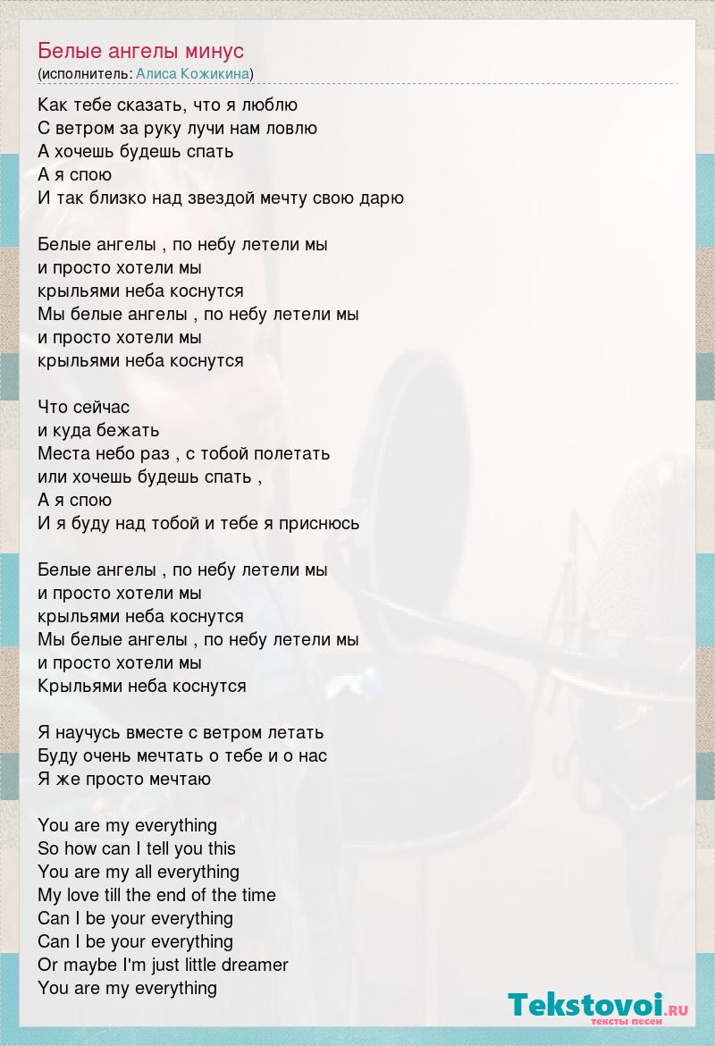 Как тебе сказать, что я люблю С ветром за руку лучи нам ловлю А хочешь будешь спать А я спою И так близко над звездой мечту свою дарю Белые ангелы , по небу летели мы и просто хотели мы крыльями неба коснутся Мы белые ангелы , по небу летели мы и просто хотели мы крыльями неба коснутся Что сейчас и куда бежать Места небо раз , с тобой полетать или хочешь будешь спать , А я спою И я буду над тобой и тебе я приснюсь Белые ангелы , по небу летели мы и просто хотели мы крыльями неба коснутся Мы белые ангелы , по небу летели мы и просто хотели мы Крыльями неба коснутся Я научусь вместе с ветром летать Буду очень мечтать о тебе и о нас Я же просто мечтаю You are my everything So how can I tell you this You are my all everything My love till the end of the time Can I be your everything Can I be your everything Or maybe I'm just little dreamer You are my everything