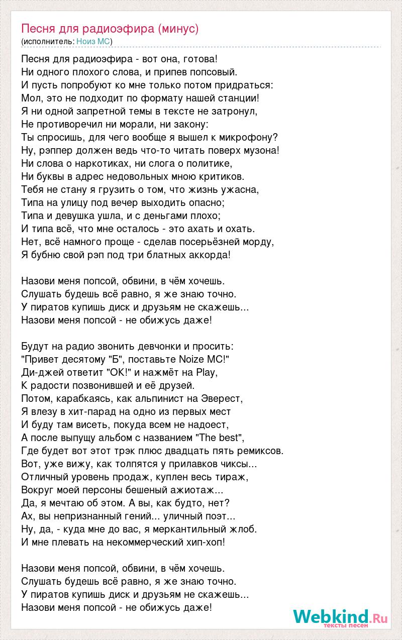 Песня для радиоэфира - вот она, готова! Ни одного плохого слова, и припев попсовый. И пусть попробуют ко мне только потом придраться: Мол, это не подходит по формату нашей станции! Я ни одной запретной темы в тексте не затронул, Не противоречил ни морали, ни закону: Ты спросишь, для чего вообще я вышел к микрофону? Ну, рэппер должен ведь что-то читать поверх музона! Ни слова о наркотиках, ни слога о политике, Ни буквы в адрес недовольных мною критиков. Тебя не стану я грузить о том, что жизнь ужасна, Типа на улицу под вечер выходить опасно; Типа и девушка ушла, и с деньгами плохо; И типа всё, что мне осталось - это ахать и охать. Нет, всё намного проще - сделав посерьёзней морду, Я бубню свой рэп под три блатных аккорда! Назови меня попсой, обвини, в чём хочешь. Слушать будешь всё равно, я же знаю точно. У пиратов купишь диск и друзьям не скажешь... Назови меня попсой - не обижусь даже! Будут на радио звонить девчонки и просить: "Привет десятому "Б", поставьте Noize MC!" Ди-джей ответит "ОК!" и нажмёт на Play, К радости позвонившей и её друзей. Потом, карабкаясь, как альпинист на Эверест, Я влезу в хит-парад на одно из первых мест И буду там висеть, покуда всем не надоест, А после выпущу альбом с названием "The best", Где будет вот этот трэк плюс двадцать пять ремиксов. Вот, уже вижу, как толпятся у прилавков чиксы... Отличный уровень продаж, куплен весь тираж, Вокруг моей персоны бешеный ажиотаж... Да, я мечтаю об этом. А вы, как будто, нет? Ах, вы непризнанный гений... уличный поэт... Ну, да, - куда мне до вас, я меркантильный жлоб. И мне плевать на некоммерческий хип-хоп! Назови меня попсой, обвини, в чём хочешь. Слушать будешь всё равно, я же знаю точно. У пиратов купишь диск и друзьям не скажешь... Назови меня попсой - не обижусь даже!